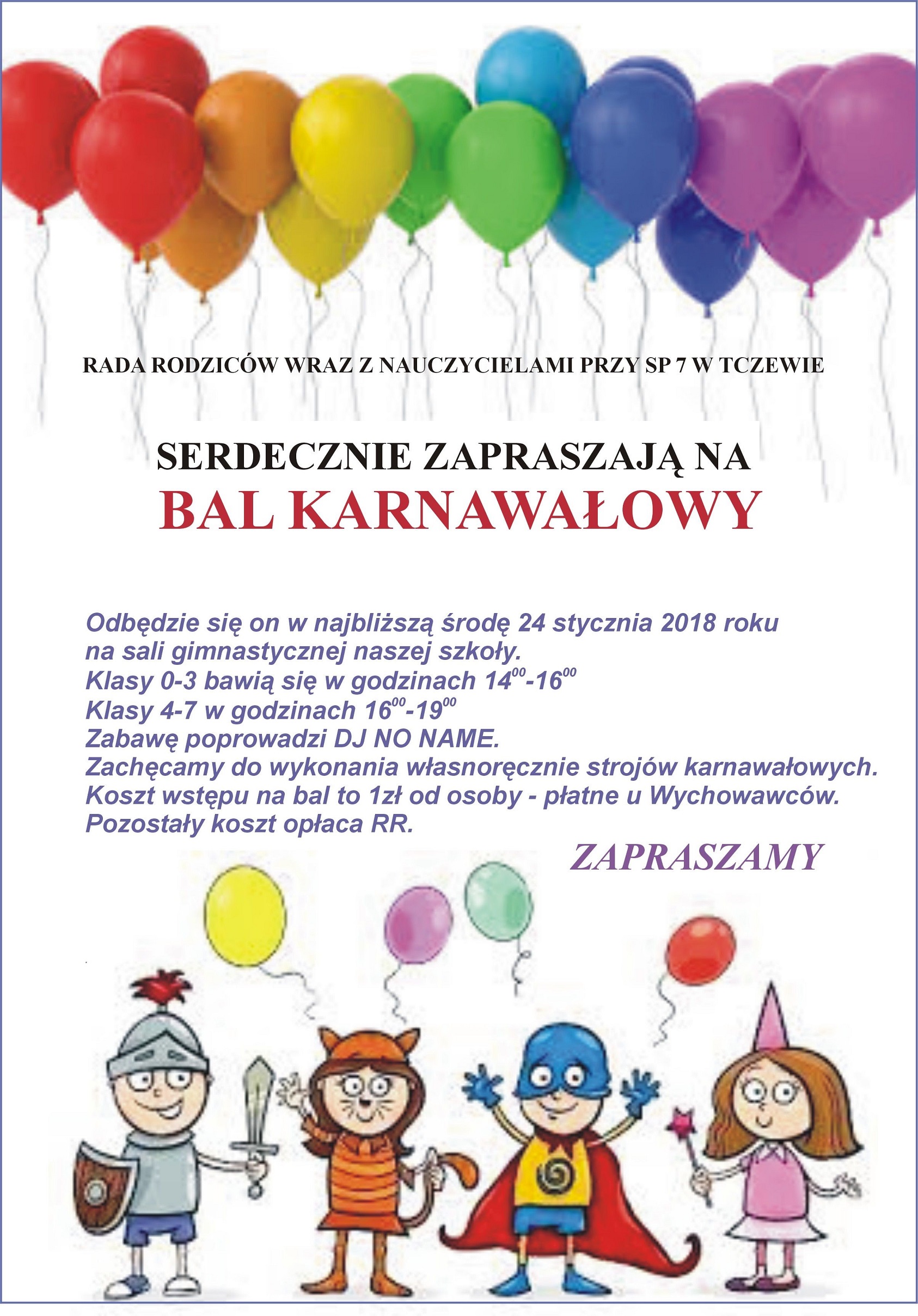 Koszt wstępu na zabawę wynosi symboliczną 1zł od osoby, płatną u wychowawcy klas do dnia 06.02.2017 .