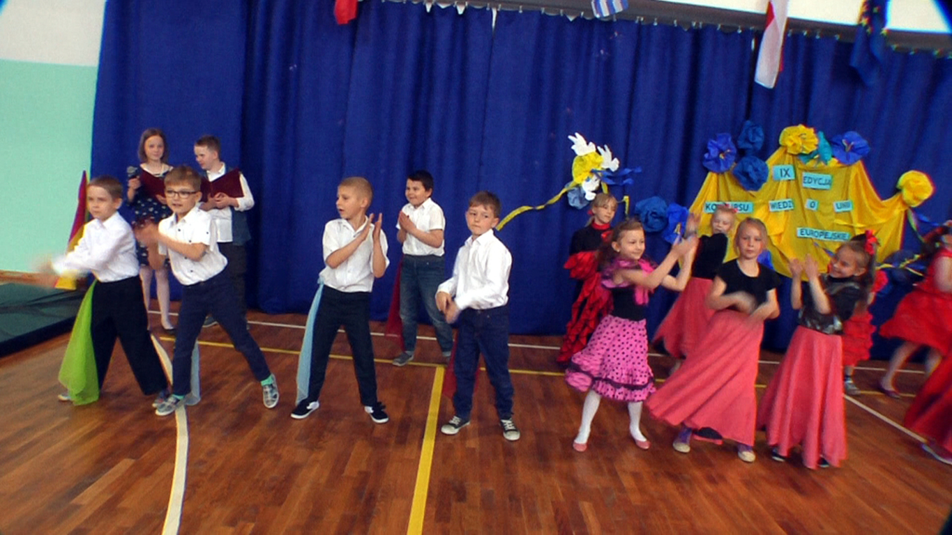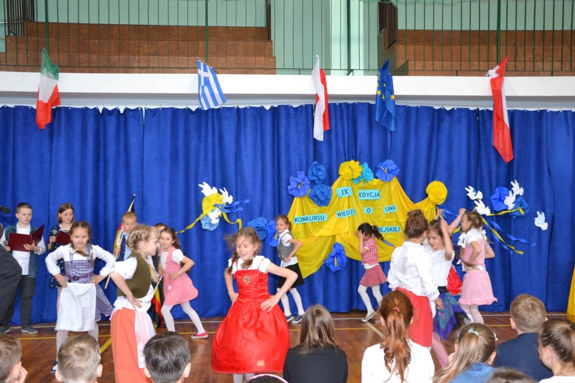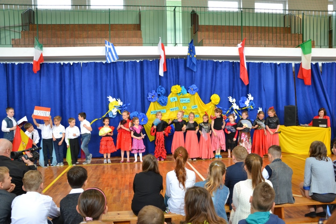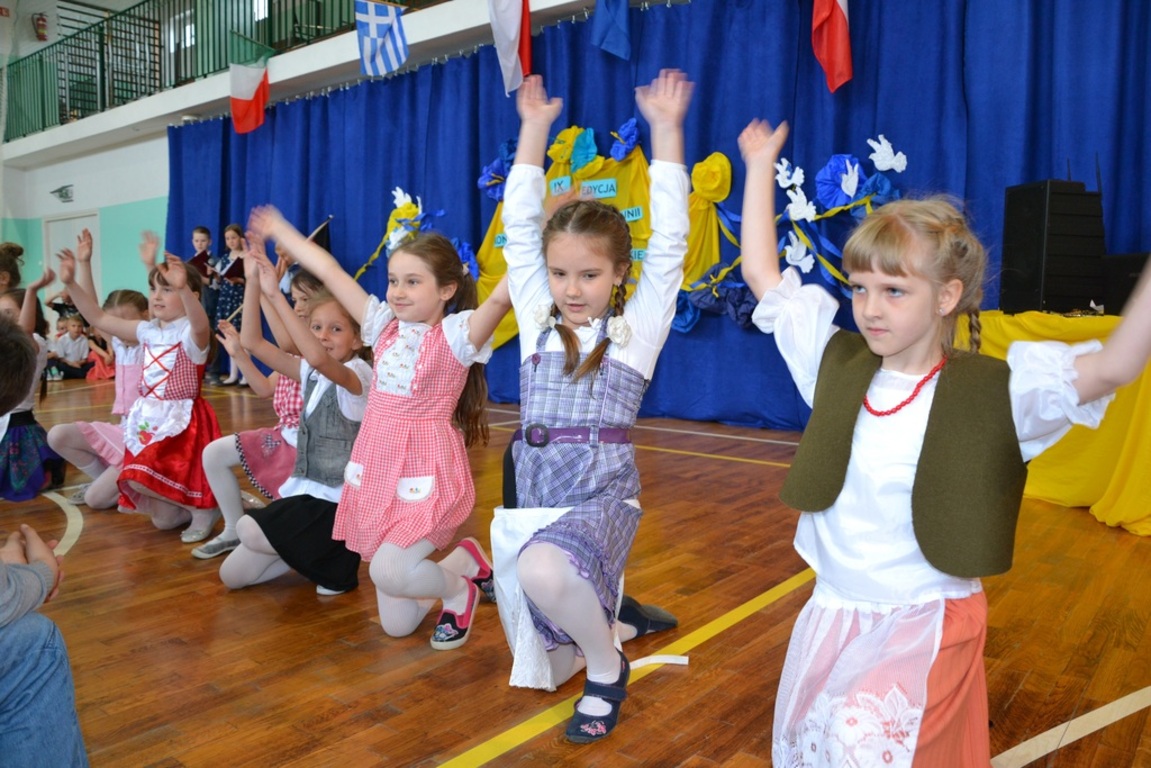 - na sali gimnastycznej odbyła się część artystyczna „Muzyczna podróż po Europie”, w której uczniowie z klas: 1a, 1b, 1c, 2a, 2b, 6a, 6b - SP nr 7 zaprezentowali taneczne uroki wybranych krajów Unii Europejskiej tj. Grecji, Hiszpanii, Niemiec, Francji.
