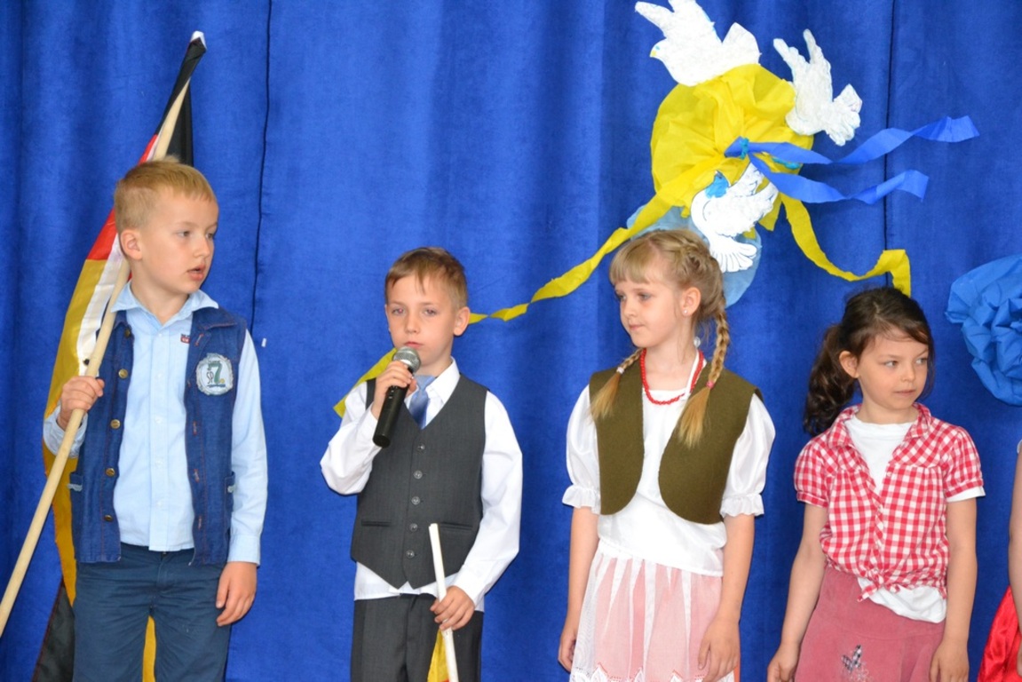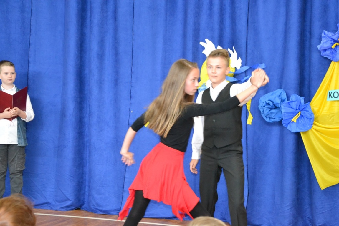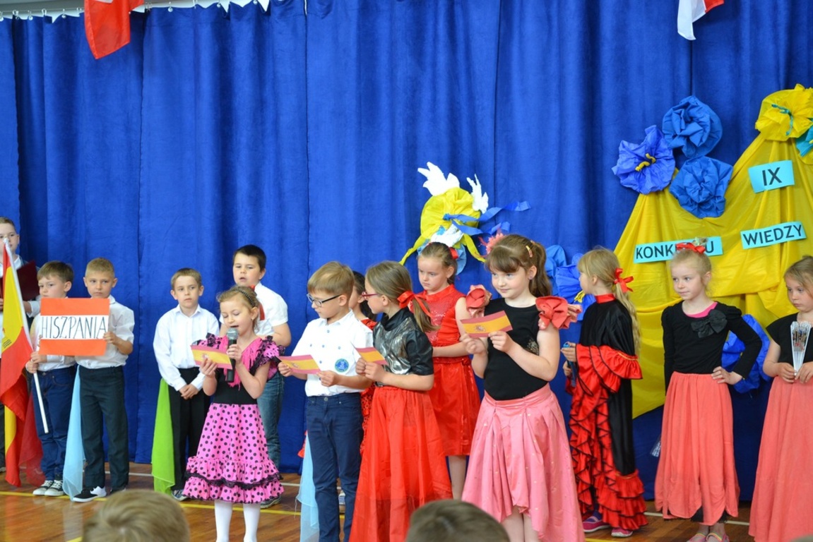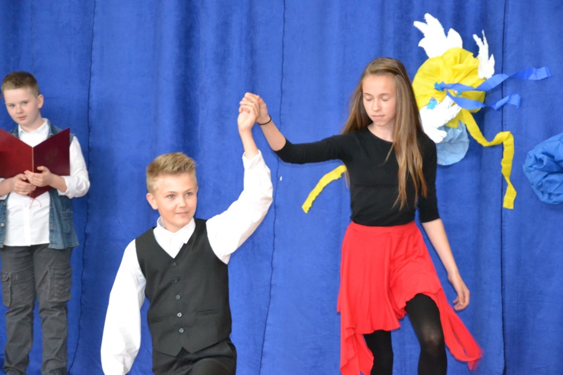 - na sali gimnastycznej odbyła się część artystyczna „Muzyczna podróż po Europie”, w której uczniowie z klas: 1a, 1b, 1c, 2a, 2b, 6a, 6b - SP nr 7 zaprezentowali taneczne uroki wybranych krajów Unii Europejskiej tj. Grecji, Hiszpanii, Niemiec, Francji.