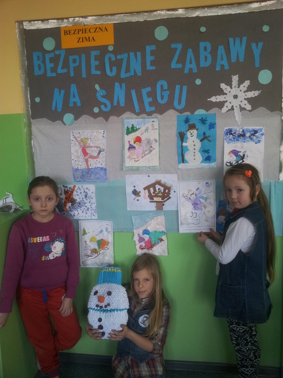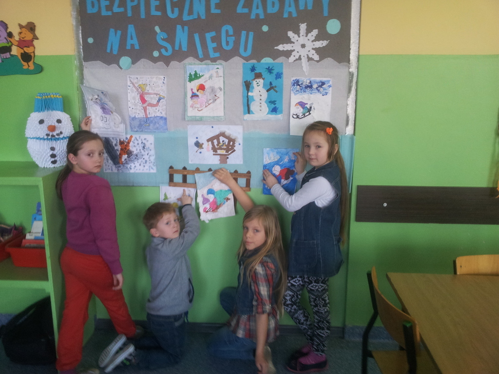 1. Bezpieczne ferie. Przeprowadzono konkurs :"Bezpieczne zabawy' oraz cykl zajęć tematycznych przypominających o bezpieczeństwie przed zimowymi feriami o, " Bezpiecznej zabawie na śniegu"