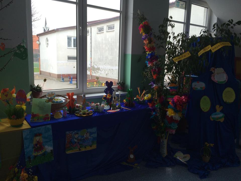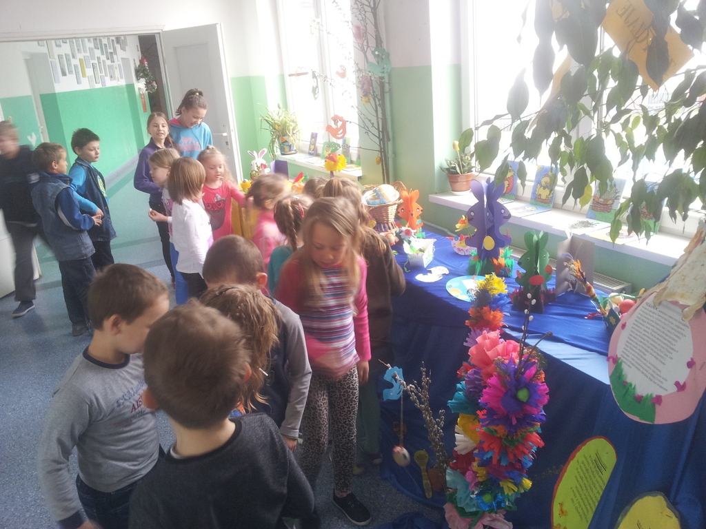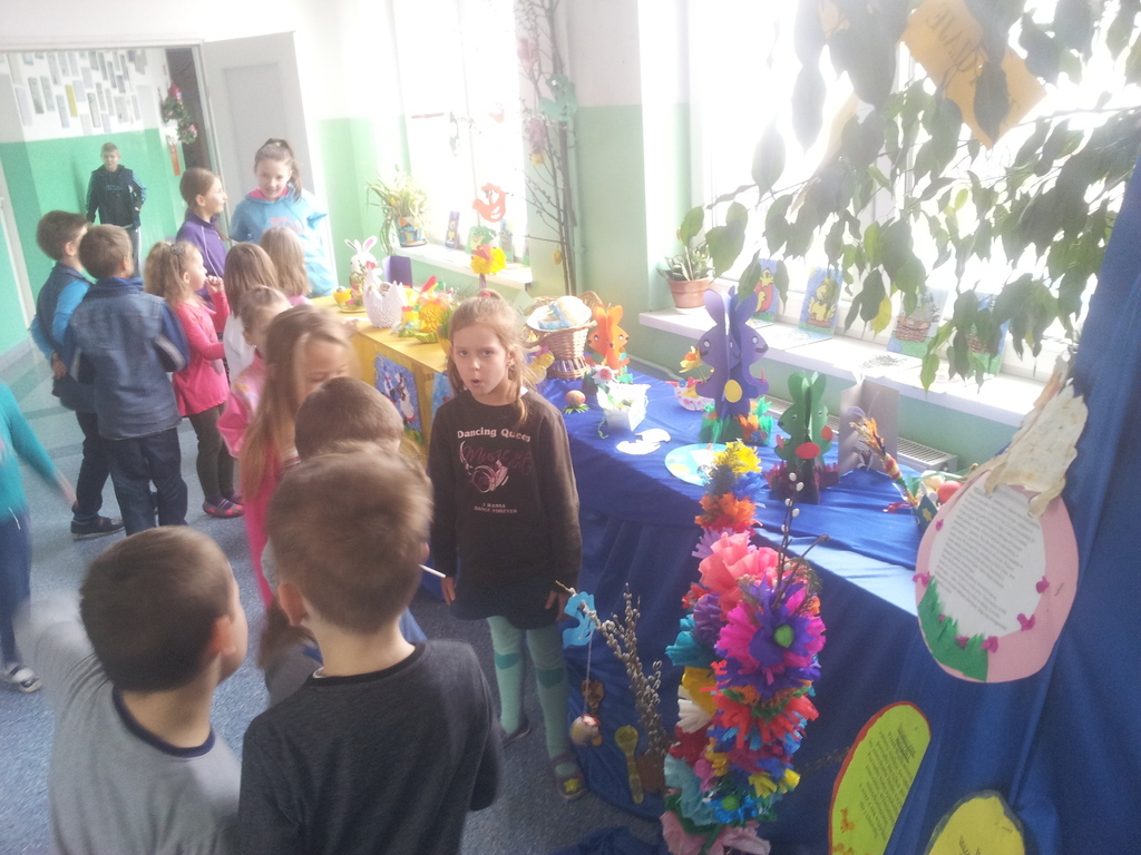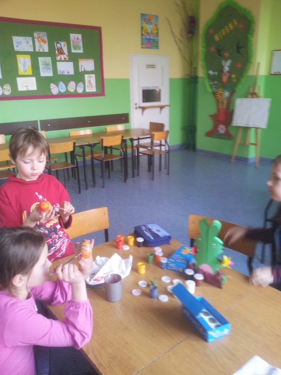 4. Tradycje i zwyczaje Wielkanocne. Świetlica szkolna zrobiła wystawę na dany temat, prac wykonanych przez dzieci różnorodnymi technikami plastycznymi. Wykonano prace płaskie i przestrzenne. Cykl zajęć tematycznych zakończonych słodką niespodzianką. Nasze dzieci szukały upominków w postaci niespodzianek wśród drzrew i krzewów, co wywołało wiele radości wśród najmłodzszych.