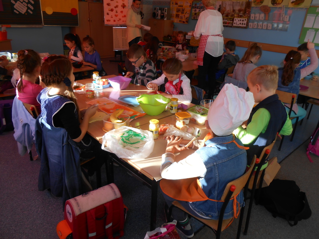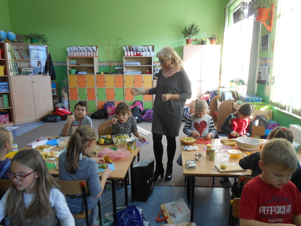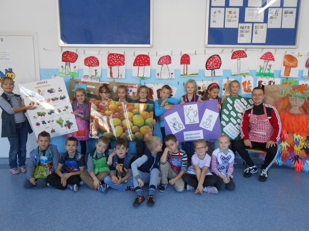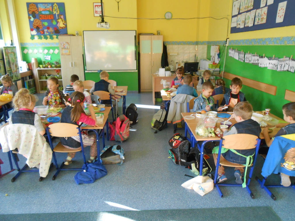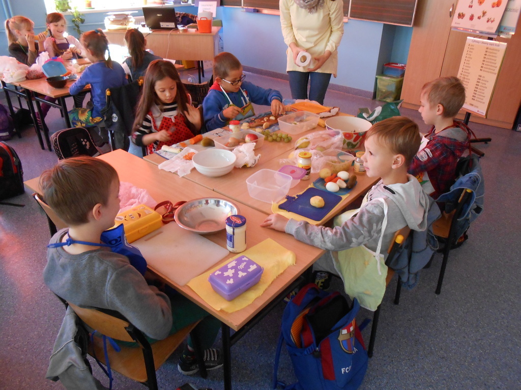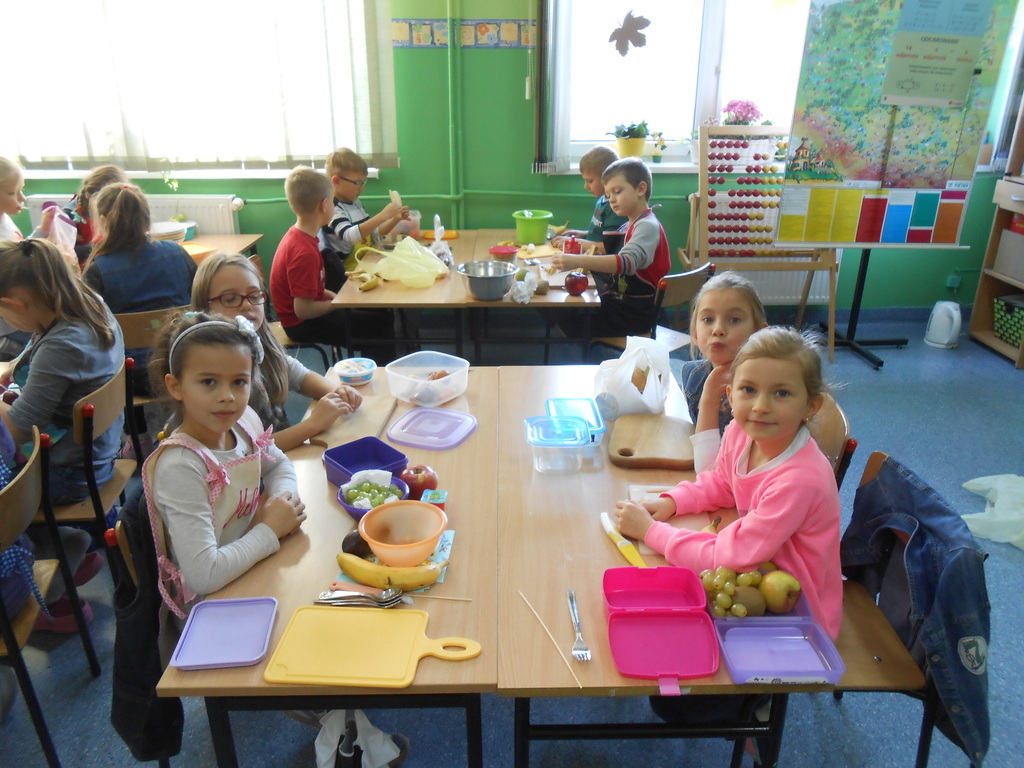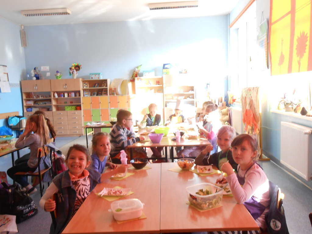 Dnia 27 października 2015 roku na terenie naszej szkoły odbyły się warsztaty kulinarne promujące zdrowy tryb odżywiania. Wychowawczynie klas 2a, 2b, 2c - p. T. Szydlik, p. W. Kowalewska oraz p. M. Podjacka włączyły się do akcji edukacyjnej "Śniadanie daje moc" i przygotowywały wspólnie z dziećmi pyszne, zdrowe sałatki warzywno-owocowe oraz kolorowe kanapki.