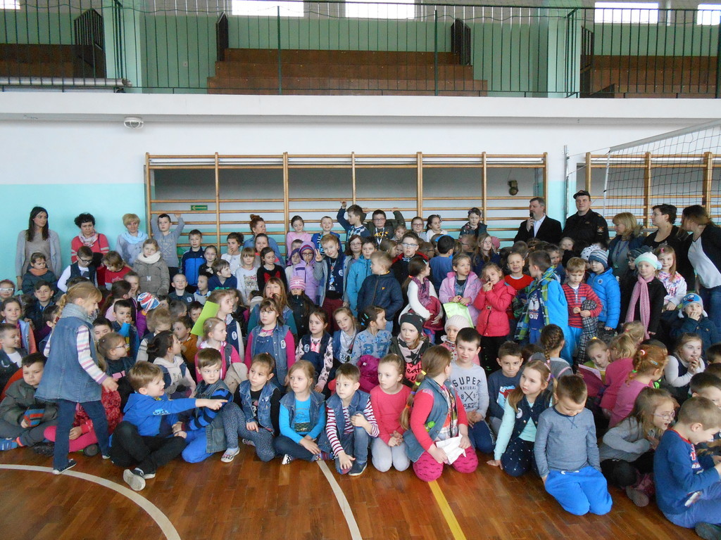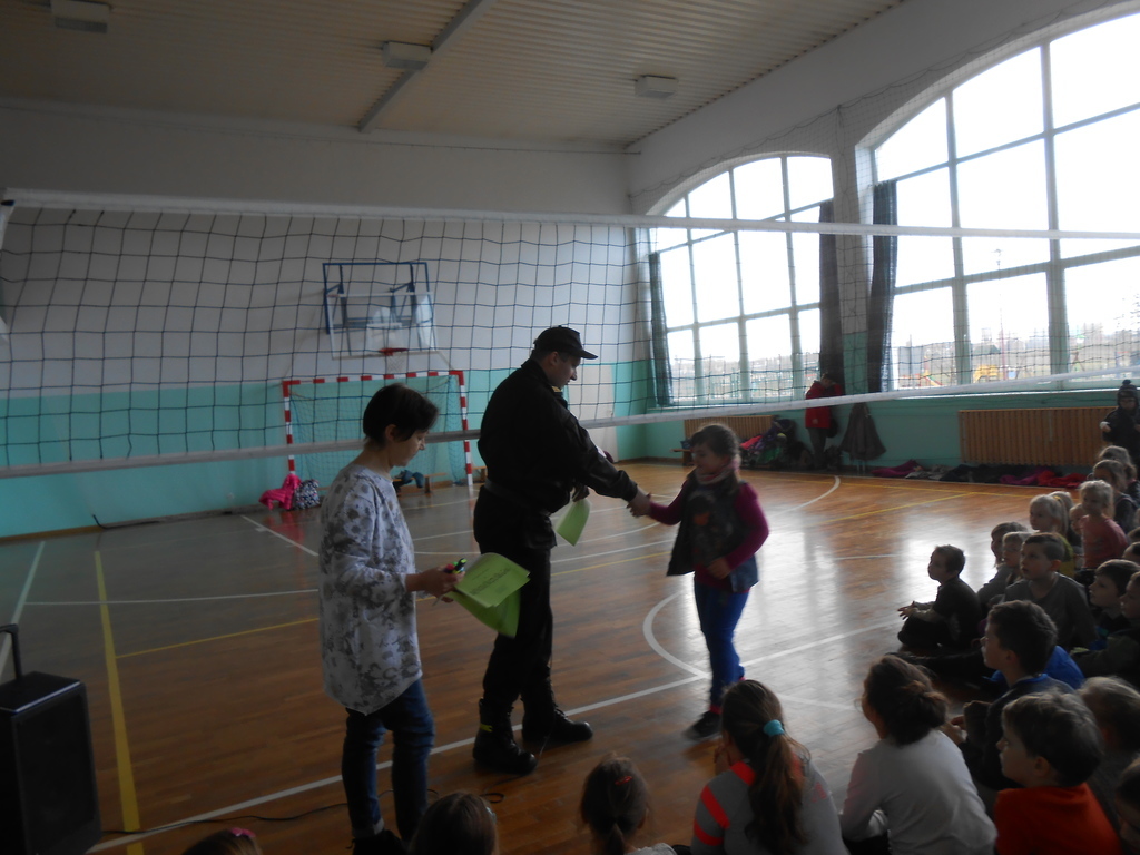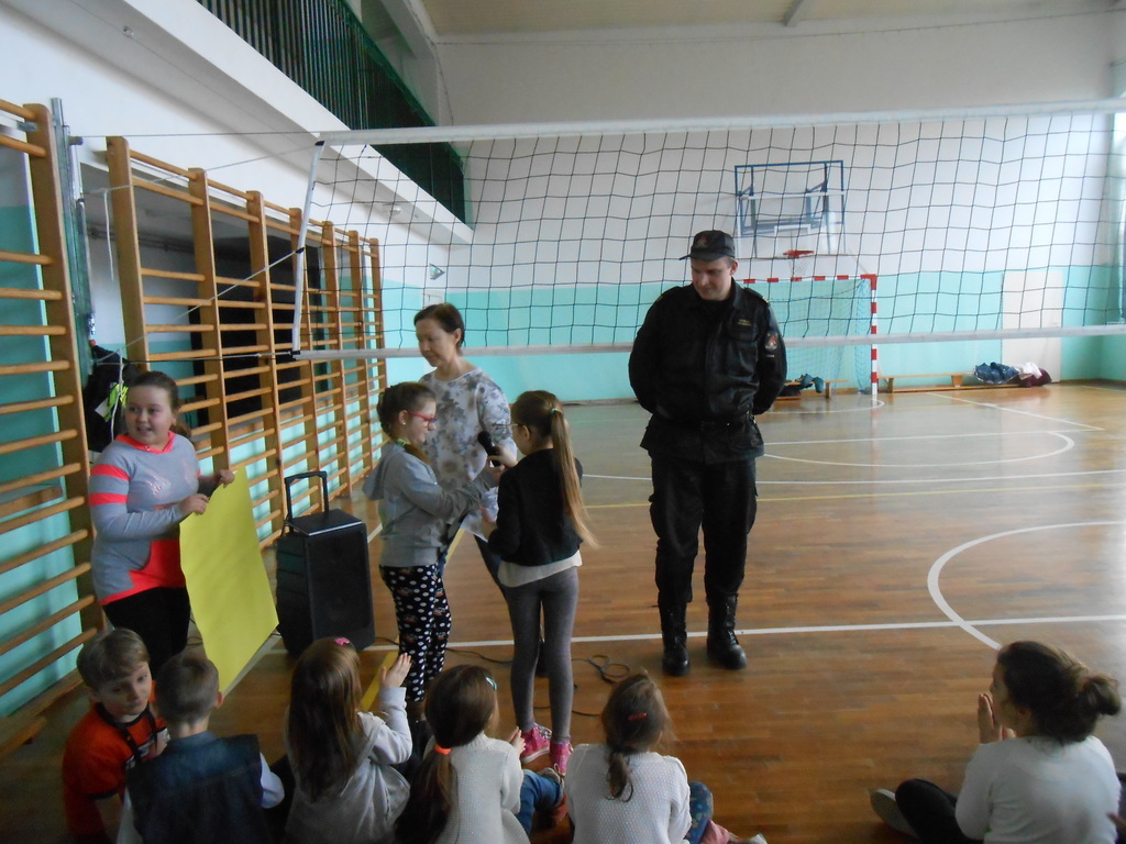 Na zakończenie spotkaliśmy się na sali gimnastycznej, gdzie odbyła się prelekcja na temat bezpieczeństwa i wszelkich zagrożeń związanych z pożarami i nie tylko oraz praktyczne zajęcia z zakresu bezpieczeństwa przeciwpożarowego.