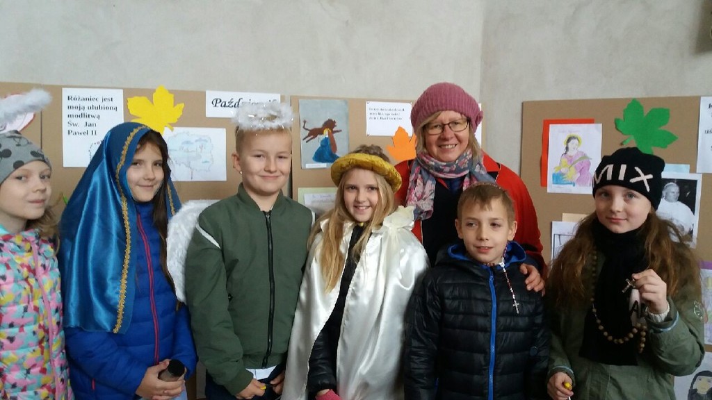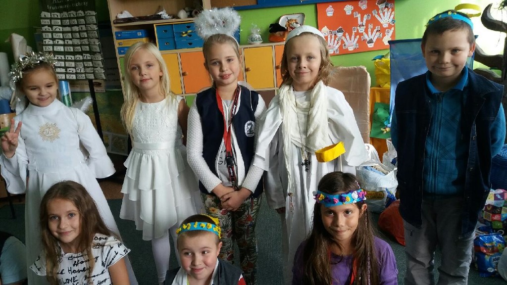 Dlatego nasz Szkoła we współpracy z ks. prob. Krzysztofem Stoltmannem zaprosiła uczniów do zabawy pod hasłem Bal Wszystkich Świętych, który odbył się w czwartek 27 października w godz. 11.45 - 12.30. Świętowanie rozpoczęło się wesołym korowodem z placu przed szkołą do Kościoła. Każdy, kto miał ochotę, mógł się przebrać za świętego lub trzymać w ręku, na plecach czy głowie rekwizyt świętego.