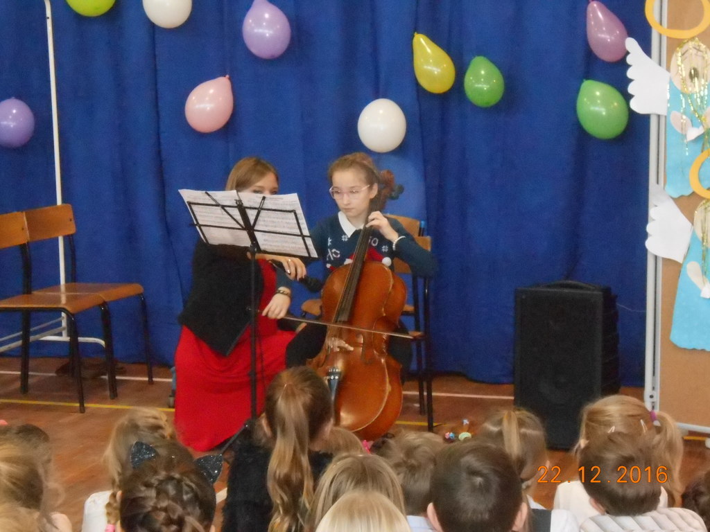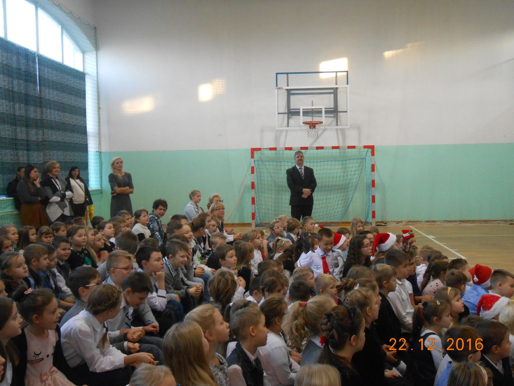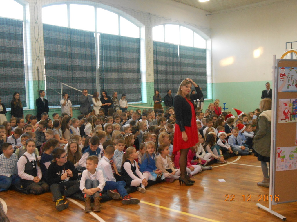 Zaśpiewali nam kilka kolęd, wprowadzając nas tym samym w świąteczną atmosferę. Następnie wszyscy udaliśmy się na klasowe wigilie, gdzie czekał na nas opłatek, wiele pyszności , no i oczywiście MIKOŁAJ.
