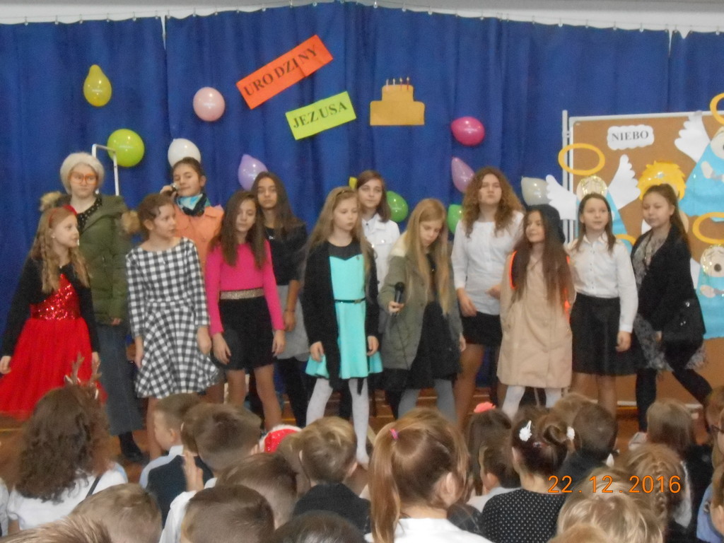 udaliśmy się na salę gimnastyczną na jasełka. Jasełka pt.: „ URODZINY JEZUSA” zostały przygotowane przez Kółko teatralne pod czujnym okiem pani Karoliny Garskiej.