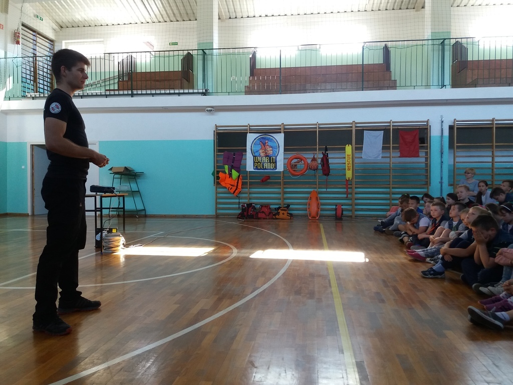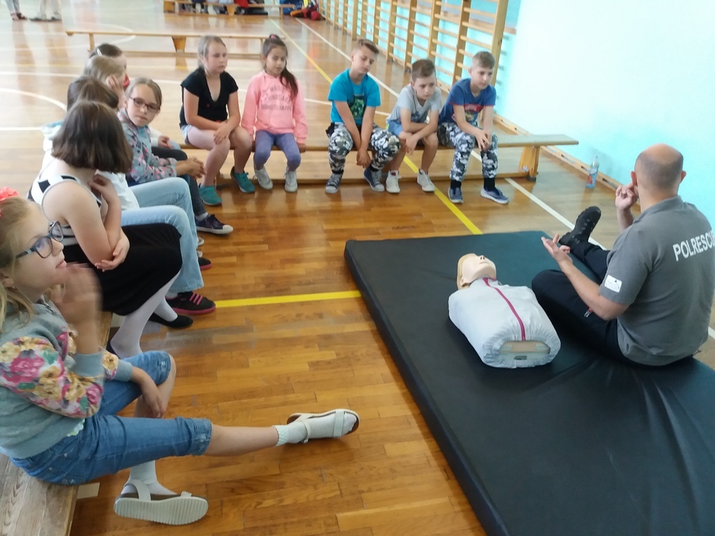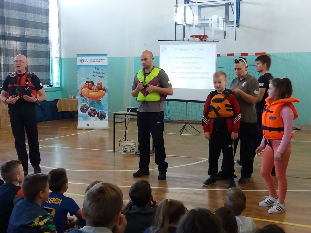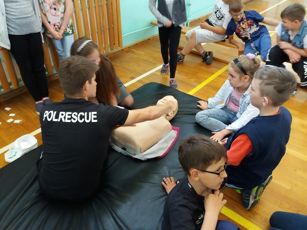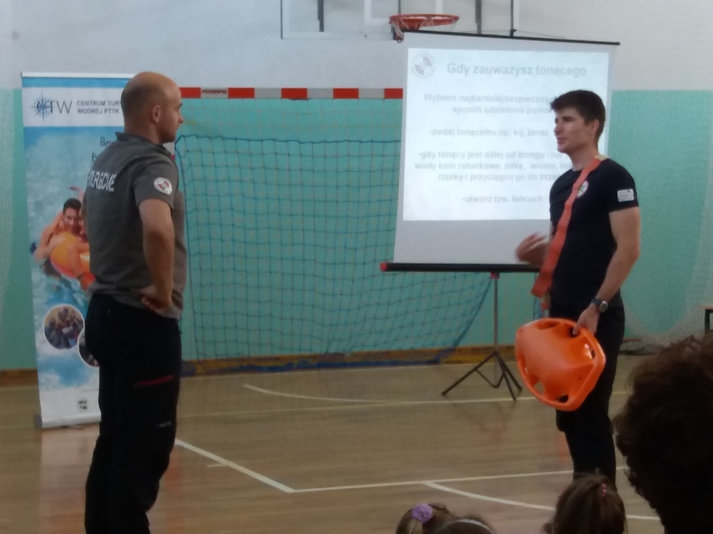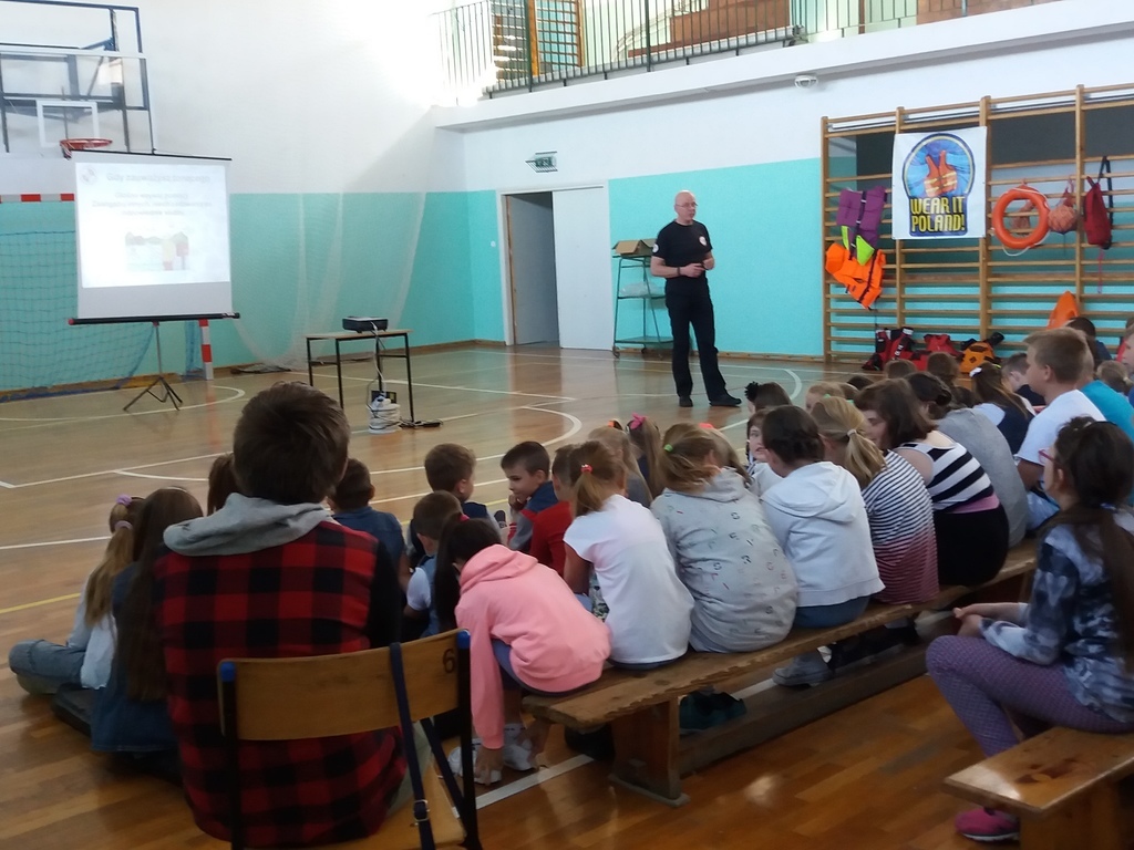 W ramach profilaktyki bezpieczeństwa oraz ogłoszonym przez Ministra "Rokiem Rzeki Wisły", pedagog szkolny nawiązał współpracę z Centrum Turystyki Wodnej PTTK w Warszwie. W związku z realizacją w 2017r. przez Centrum Turystyki Wodnej PTTK projektu, pn. "woda, dziecko, bezpieczeństwo, akcja informacyjno - edukacyjna", w ramach, którego przeprowadzone zostały zadania dotyczące szkolenia teoretycznego i praktycznego z zakresu nauki udzielania pierwszej pomocy przed medycznej. W zajęciach udział wzięli uczniowie klas III - VI. Podczas zajęć wymieniono i omówiono zagrożenia nad i na wodzie, pokazanie przy pomocy prezentacji multimedialnej wyposażenia kąpielisk strzeżonych i elementów ich wyposażenia, praktyczny pokaz ich użycia. Ćwiczenia odbywały sie z udziałem uczniów. Następnie uczyli się resuscytacji krążeniowo - oddechowej przez zawodowych instruktorów i ratowników medycznych. Wszyscy uczniowie na koniec otrzymali certyfikaty ukończenia szkolenia oraz przydatne prezenty m.in. kolorowanki, czepki, apteczki, gazetki informacyjne.