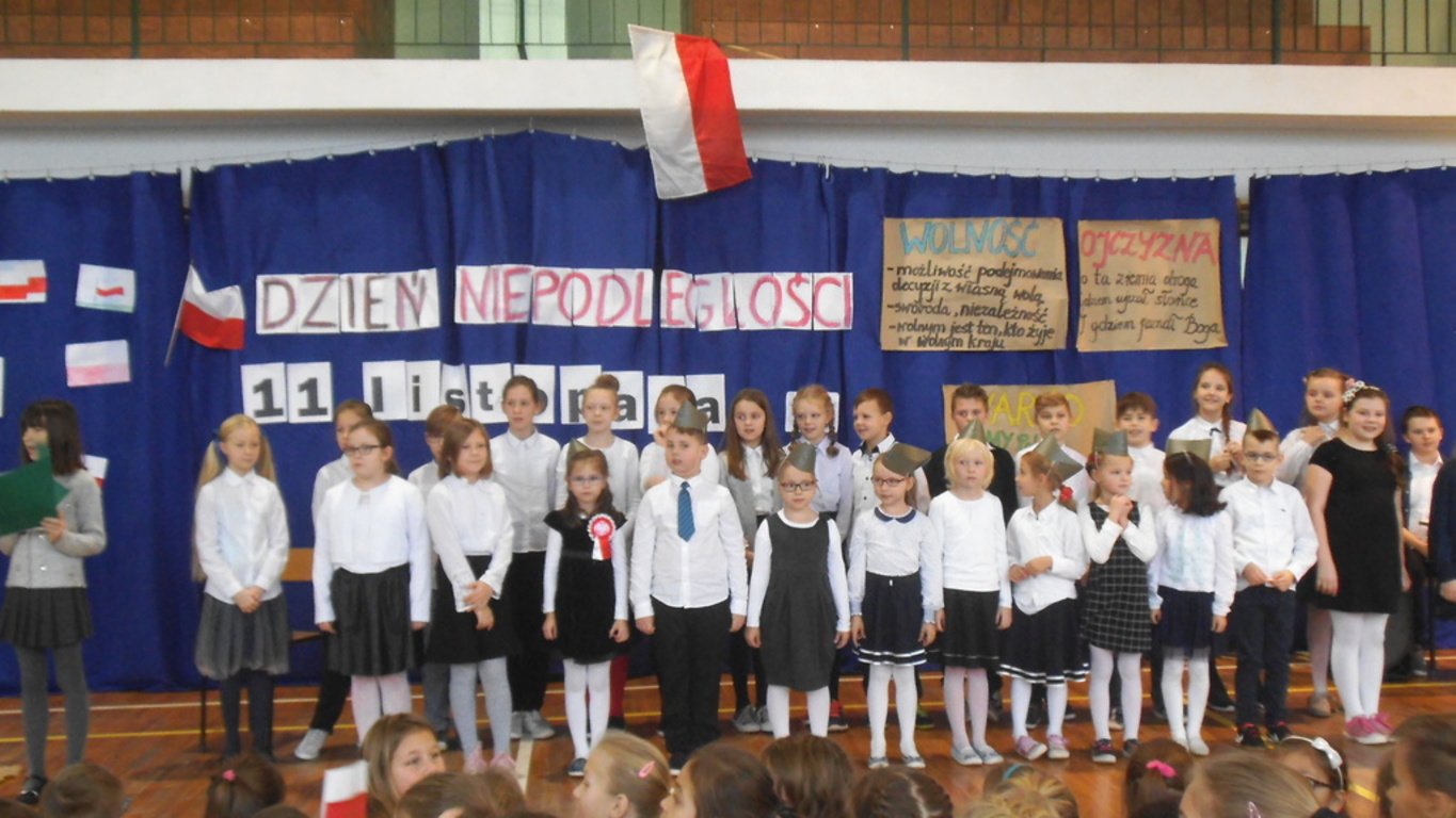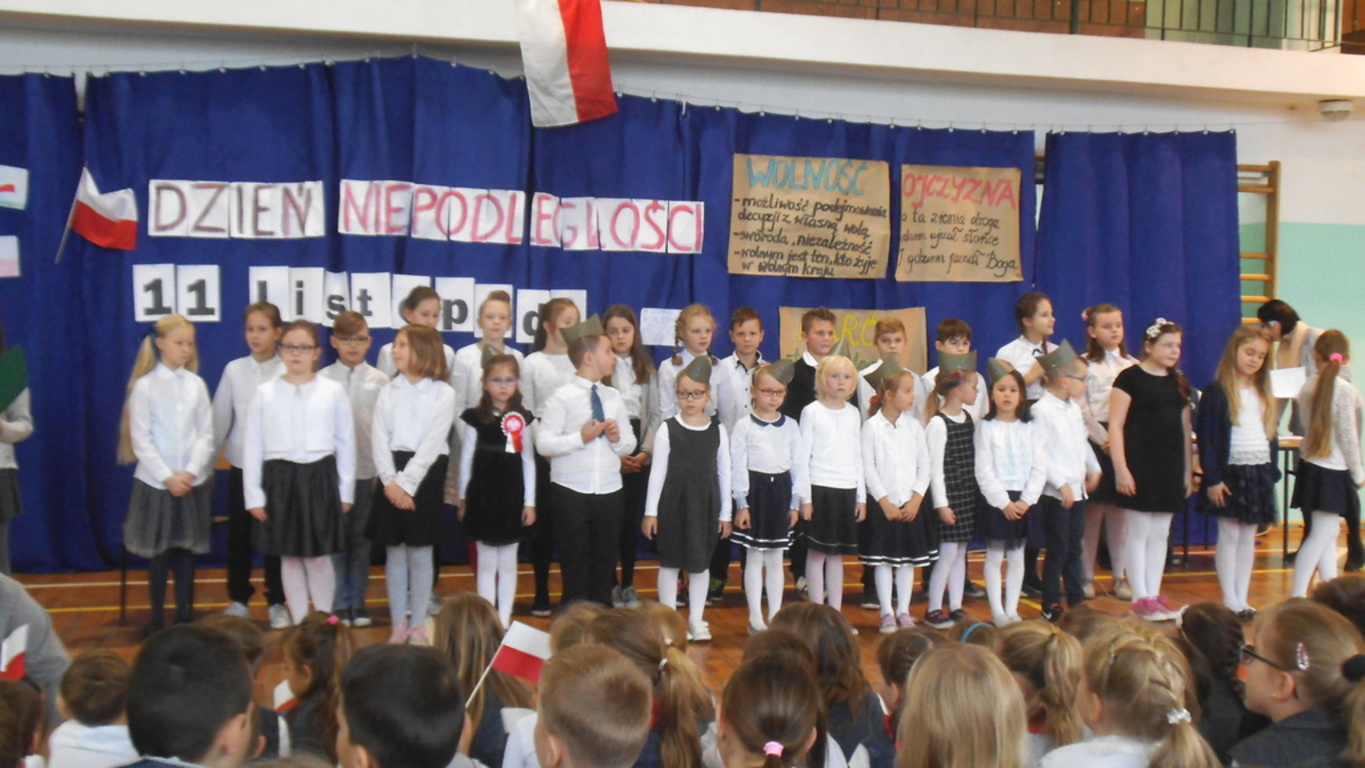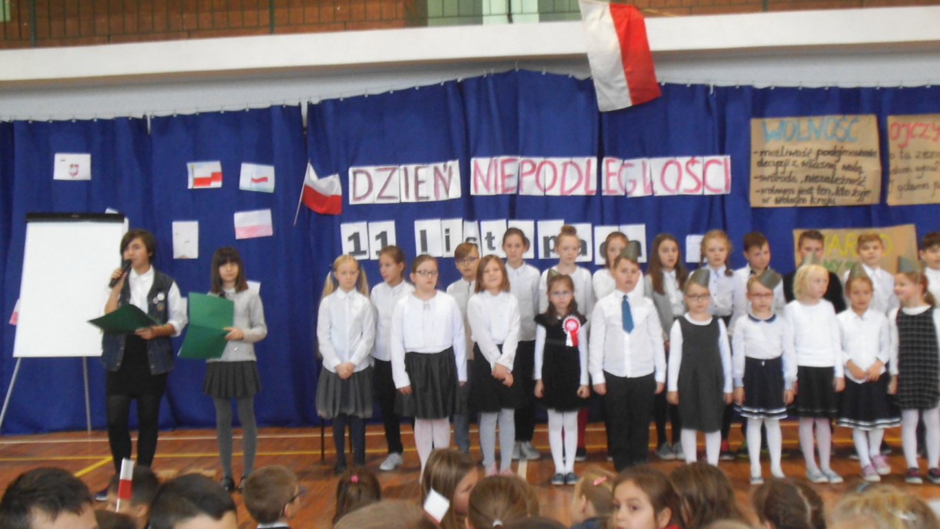 p. Wioletty Kowalewskiej, p. Anny Poniewskiej oraz p. B. Rokity. Młodzi aktorzy zaprezentowali wizję dawnego i współczesnego patriotyzmu, przedstawili także historię naszej Ojczyzny. Uroczystość wzbogacił występ chóru patriotycznego prowadzonego przez panią Wiolettę Kowalewską. Warto nadmienić, iż o dekorację zadbała klasa IVA wraz z wychowawcą p. Magdaleną Fraszkiewicz.