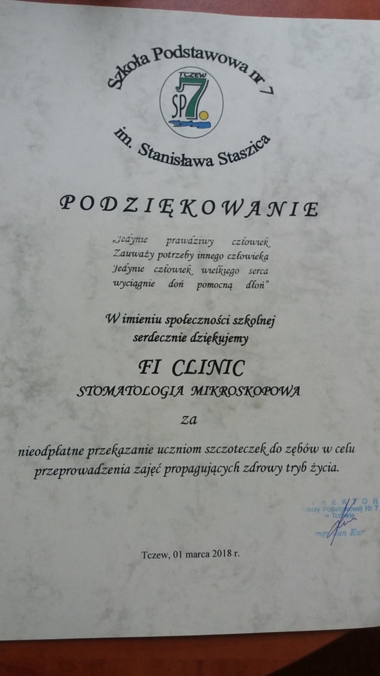 Dziękujemy Fi Clinic za nieodpłatne przekazanie 65 sztuk szczoteczek dla uczniów naszej szkoły. Pedagog w ramach lekcji dot. higieny jamy ustnej oraz zdrowego odżywiania, przekaże je dzieciom w oddziale przedszkolnym oraz dwóch klasach pierwszych. Będzie to bardzo miły prezent dla naszych milusińskich.
