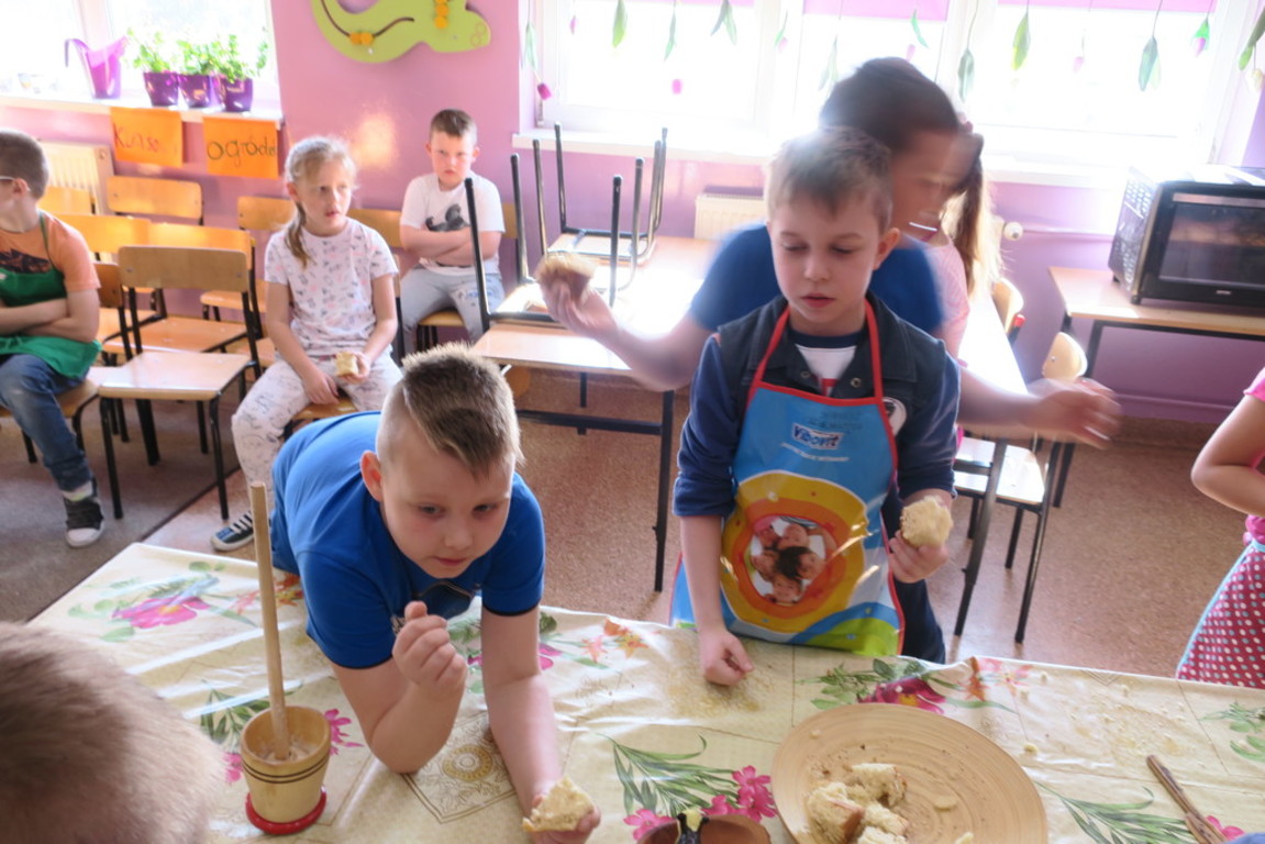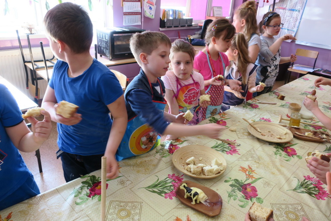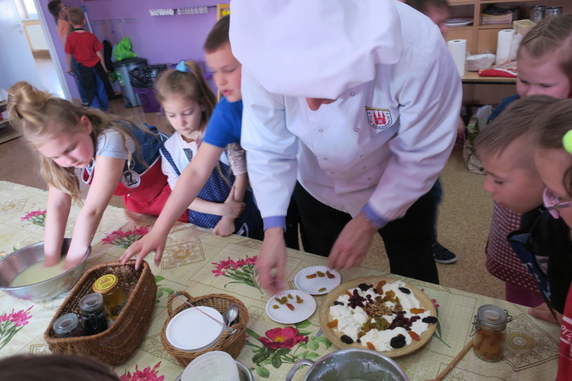 W naszej szkole odbył się pokaz kuchni tradycyjnej, dzieci z klas 0-III wytwarzały sery, masło