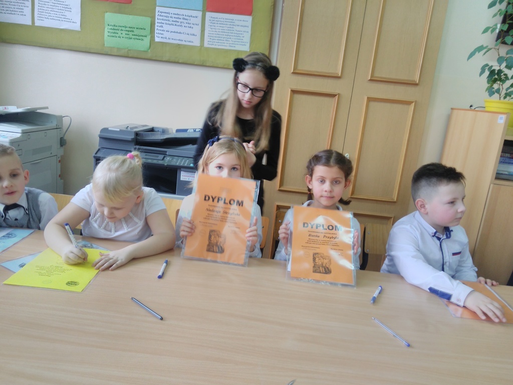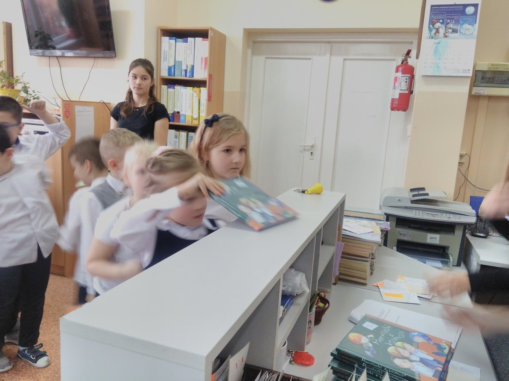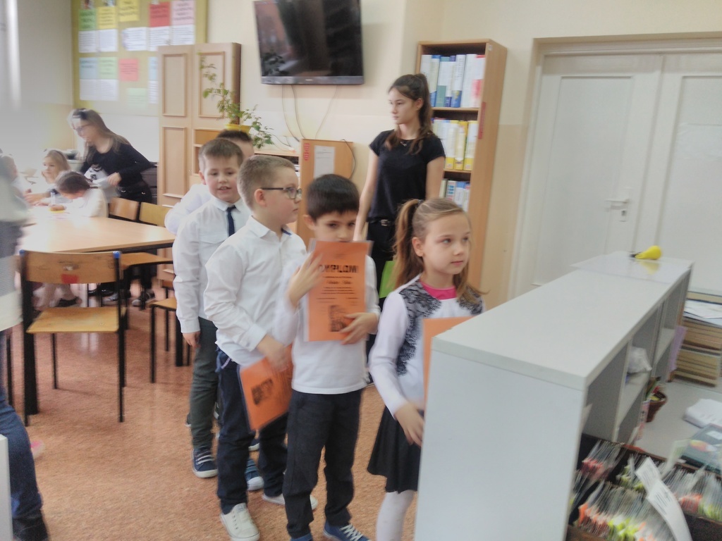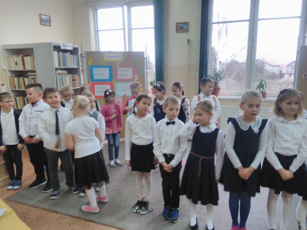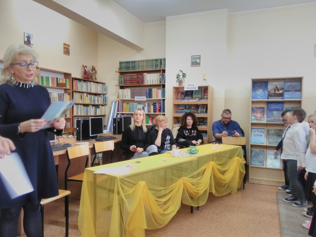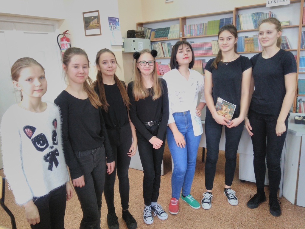 Najpierw odbył się krótki program artystyczny w wykonaniu członków Koła Przyjaciół Biblioteki – Małgosia Michalak, Nikola Szulc, Julia Podjacka, Weronika Olszewska, Wiktoria Dus, Wiktoria Tuszyńska, Zuzia Sawczak - pod czujnym okiem Pani mgr Zdzisławy Mszanowskiej – naszej szkolnej bibliotekarki.