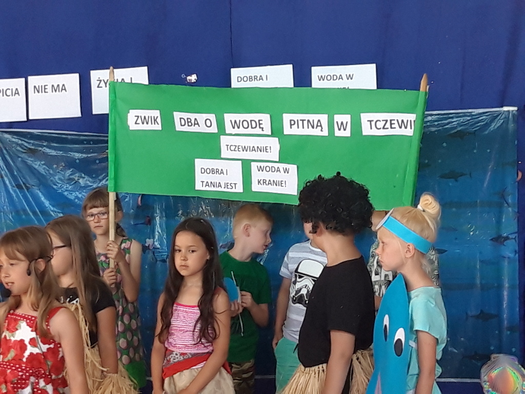 Dnia 18.06.2019r. uczniowie z klasy 3B, 5b i 5C pod opieką pani Wioletty Kowalewskiej zaprezentowali na sali gimnastycznej, w formie konferencji naukowej ekologiczne przedstawienie poświęcone problemom wody pitnej w Europie i na świecie. Uczniowie zwrócili uwagę na rolę, jaką w naszym mieście - Tczewie odgrywa Zakład Wodociągów i Kanalizacji. Młodzi ekolodzy przedstawili wyniki badań ZWiK, na temat korzyści wynikających z picia wody z kranu, która zawiera pierwiastki i mikroelementy, w tym „pierwiastki życia” – magnez i wapń. Pijąc wodę z kranu oszczędzamy pieniądze i minimalizujemy zużycie plastiku, chronimy przyrodę przed skażeniem. Z danych statystycznych wynika, że Polacy w roku 2017, wypili ponad 3,1 miliarda litrów wody z butelek. Produkcja tej wody jest 300 do 500 razy droższa od wyprodukowania wody z kranu. Po wykorzystaniu wody, butelki stają się odpadem trudno rozkładalnym, co stanowi poważny problem ekologiczny.