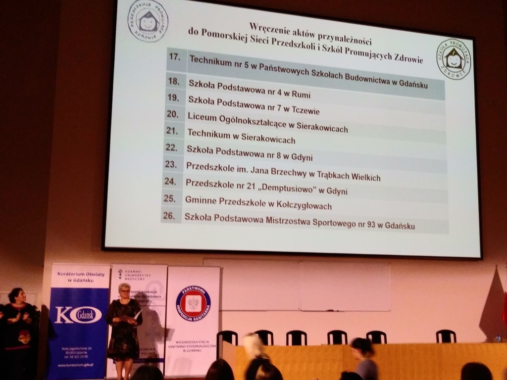 5 grudnia odbyła się Konferencja dla przedszkoli/szkół/placówek oświatowych realizujących program Szkoła Promująca Zdrowie i zainteresowanych przystąpieniem do Pomorskiej Sieci Przedszkoli/ Szkół Promujących Zdrowie pn. „Zdrowy posiłek w domu i w szkole”. Nasza SIÓDEMKA otrzymała AKT PRZYNALEŻNOŚCI do Pomorskiej Sieci Przedszkoli i Szkół Promujących Zdrowie, tytuł ten został nadany przez Pomorskiego Kuratora Oświaty. Akt odebrały wicedyrektor Katarzyna Baza oraz pedagog (koordynator programu) Aleksandra Sperling. Serdecznie dziękujemy wszystkim, którzy przyczynili się do naszego sukcesu!