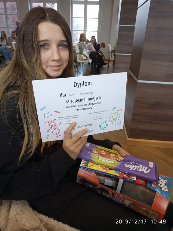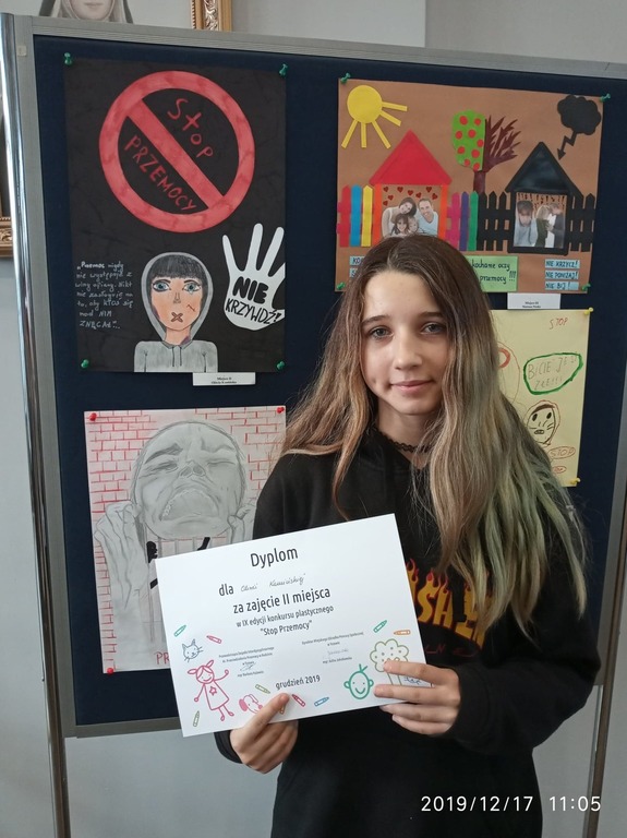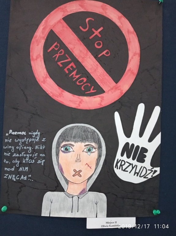 Uczniowie naszej szkoły wzięli udział w konkursie organizowanym przez Miejski Ośrodek Pomocy Społecznej pod tyułem Stop przemocy. Dziewięć prac otrzymało wyróżnienia, a praca Oliwii Kamińskiej otrzymała II miejsce. Dziękujemy wszystkim za udział w konkursie!