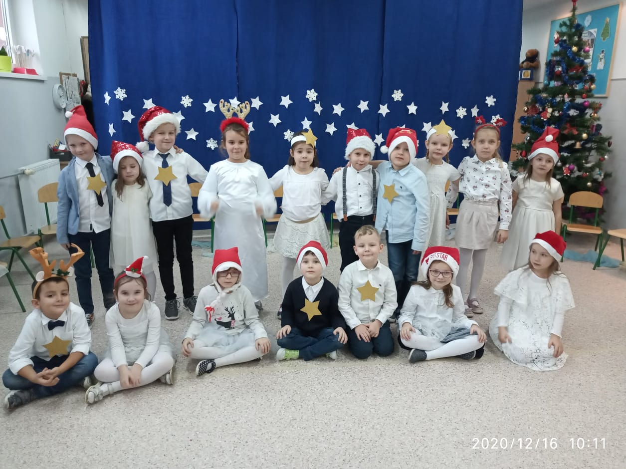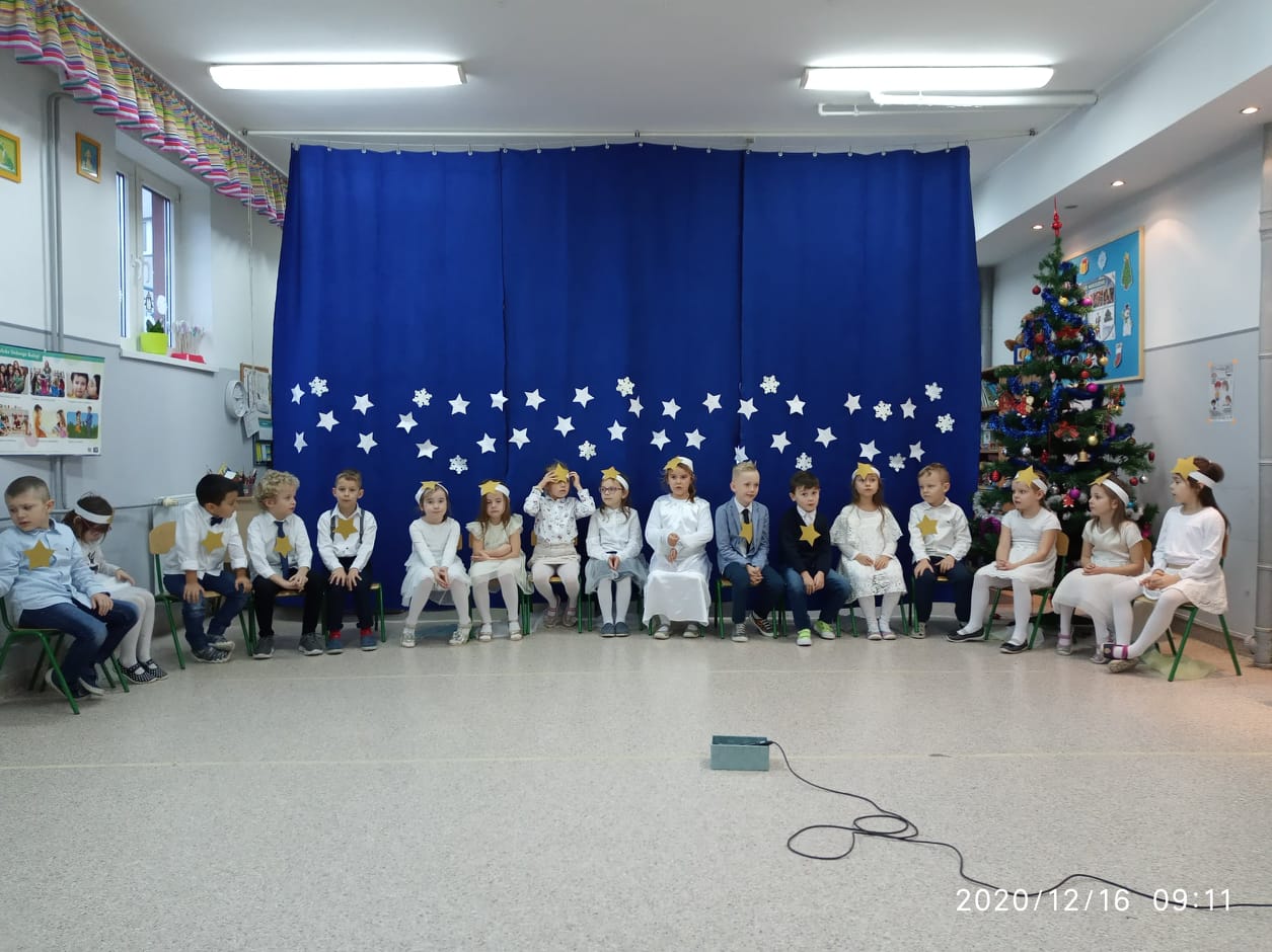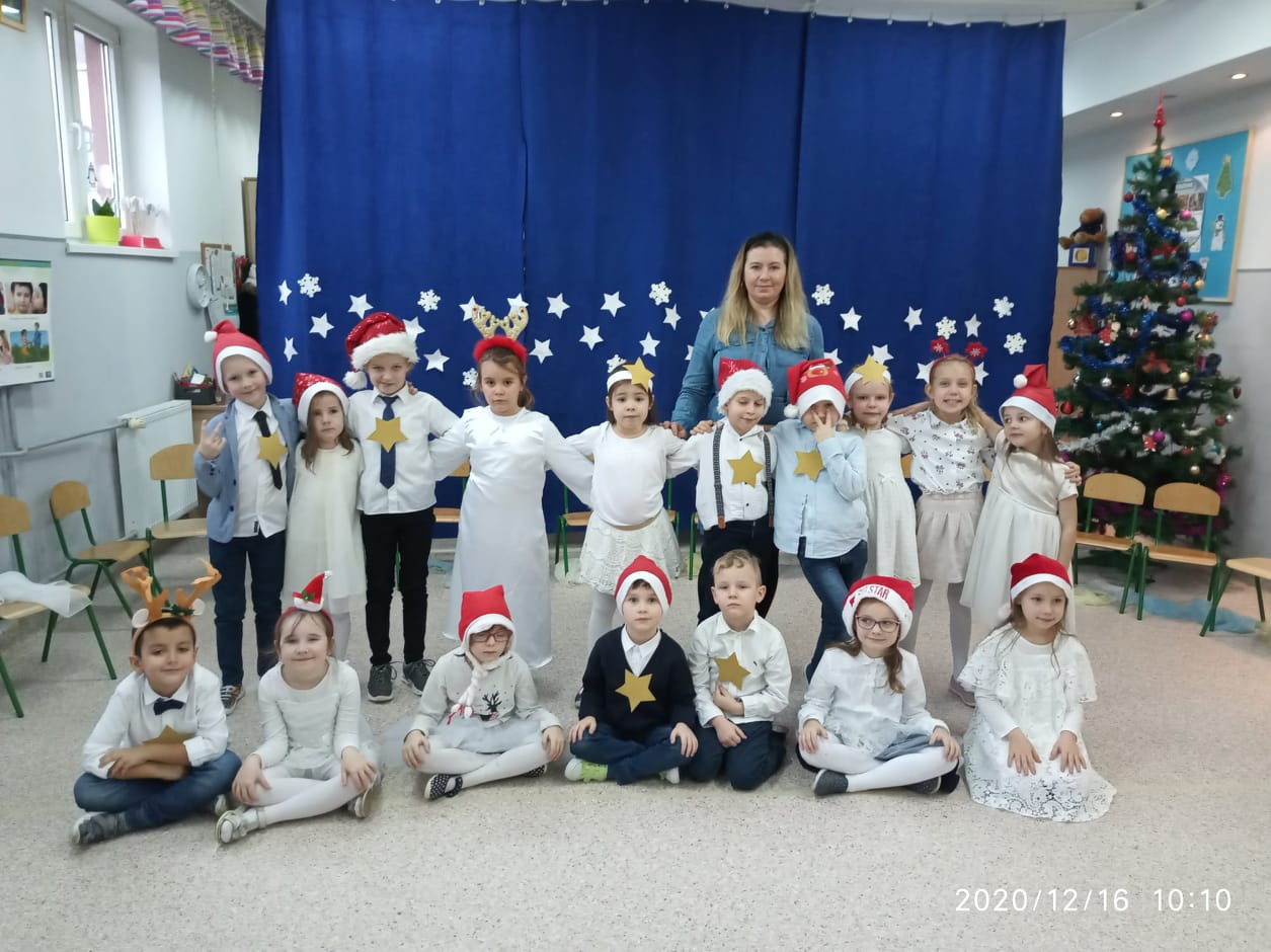 Tuż przed Świętami Bożego Narodzenia podniosła i odświętna atmosfera zagościła w obu grupach naszych Zerówek. Ze względu na pandemię nie mogliśmy zaprosić Gości, natomiast przedstawienia zostały nagrane i przekazane rodzicom naszych pociech. Bożonarodzeniowy klimat dopełniały okolicznościowe dekoracje, lampki, choinka oraz wspólne śpiewanie kolęd. Najważniejszym punktem spotkania był program artystyczny w wykonaniu naszych zdolnych Zerówkowiczów. Dzieci z zaangażowaniem śpiewały kolędy oraz utwory o tematyce świątecznej, prezentowały nauczone role oraz układ taneczny.