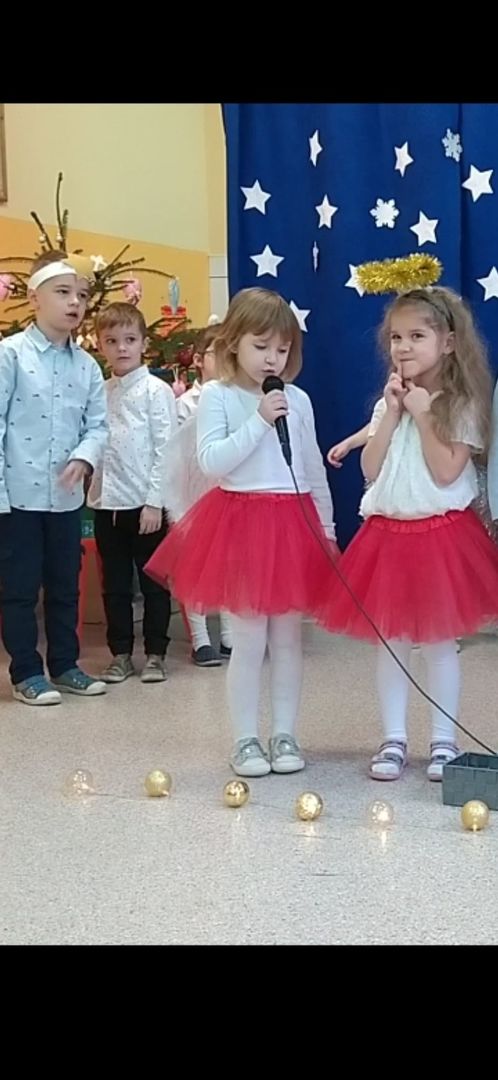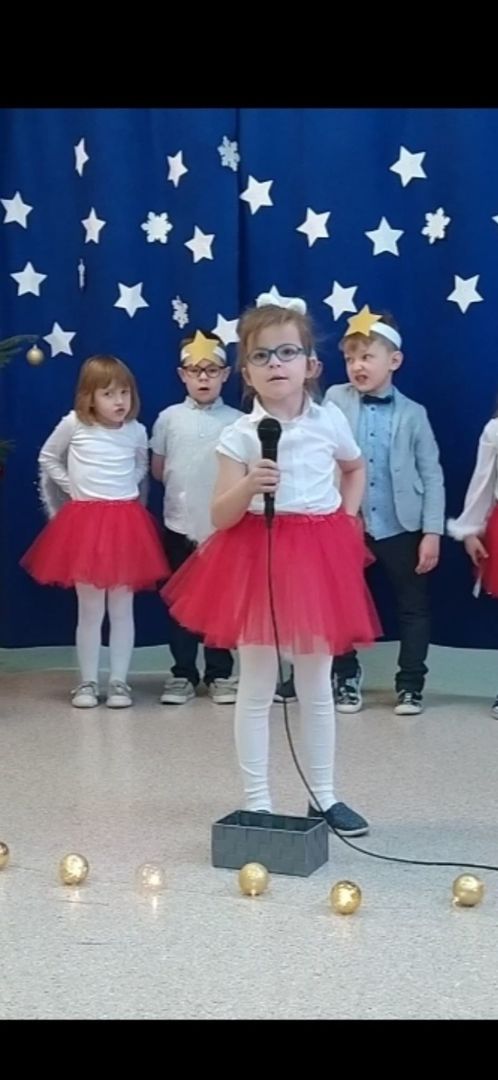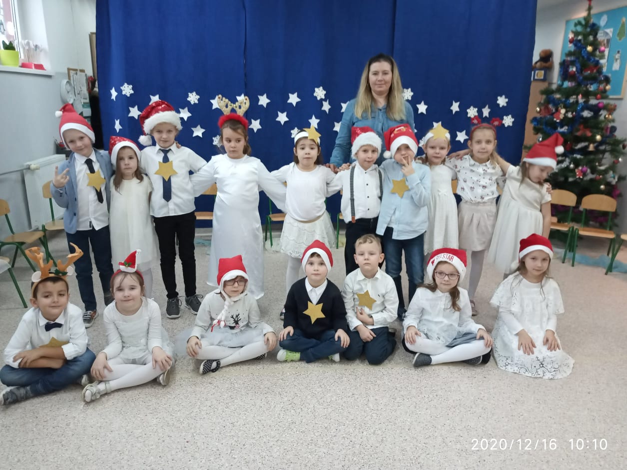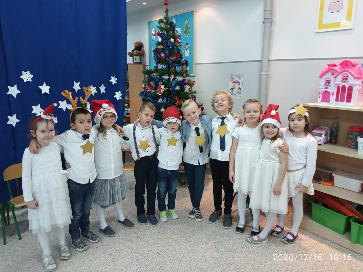 Tuż przed Świętami Bożego Narodzenia podniosła i odświętna atmosfera zagościła w obu grupach naszych Zerówek. Ze względu na pandemię nie mogliśmy zaprosić Gości, natomiast przedstawienia zostały nagrane i przekazane rodzicom naszych pociech. Bożonarodzeniowy klimat dopełniały okolicznościowe dekoracje, lampki, choinka oraz wspólne śpiewanie kolęd. Najważniejszym punktem spotkania był program artystyczny w wykonaniu naszych zdolnych Zerówkowiczów. Dzieci z zaangażowaniem śpiewały kolędy oraz utwory o tematyce świątecznej, prezentowały nauczone role oraz układ taneczny.