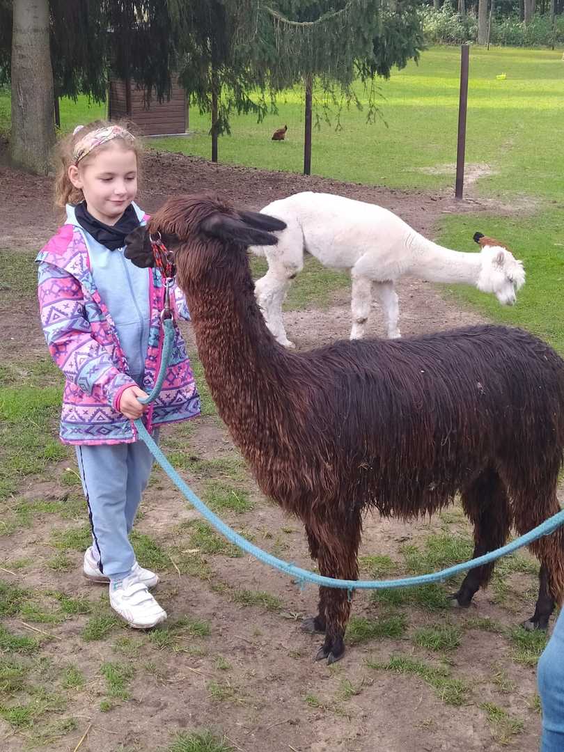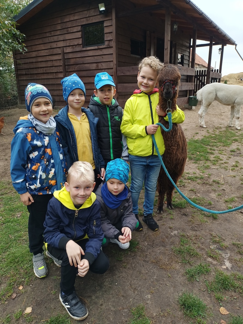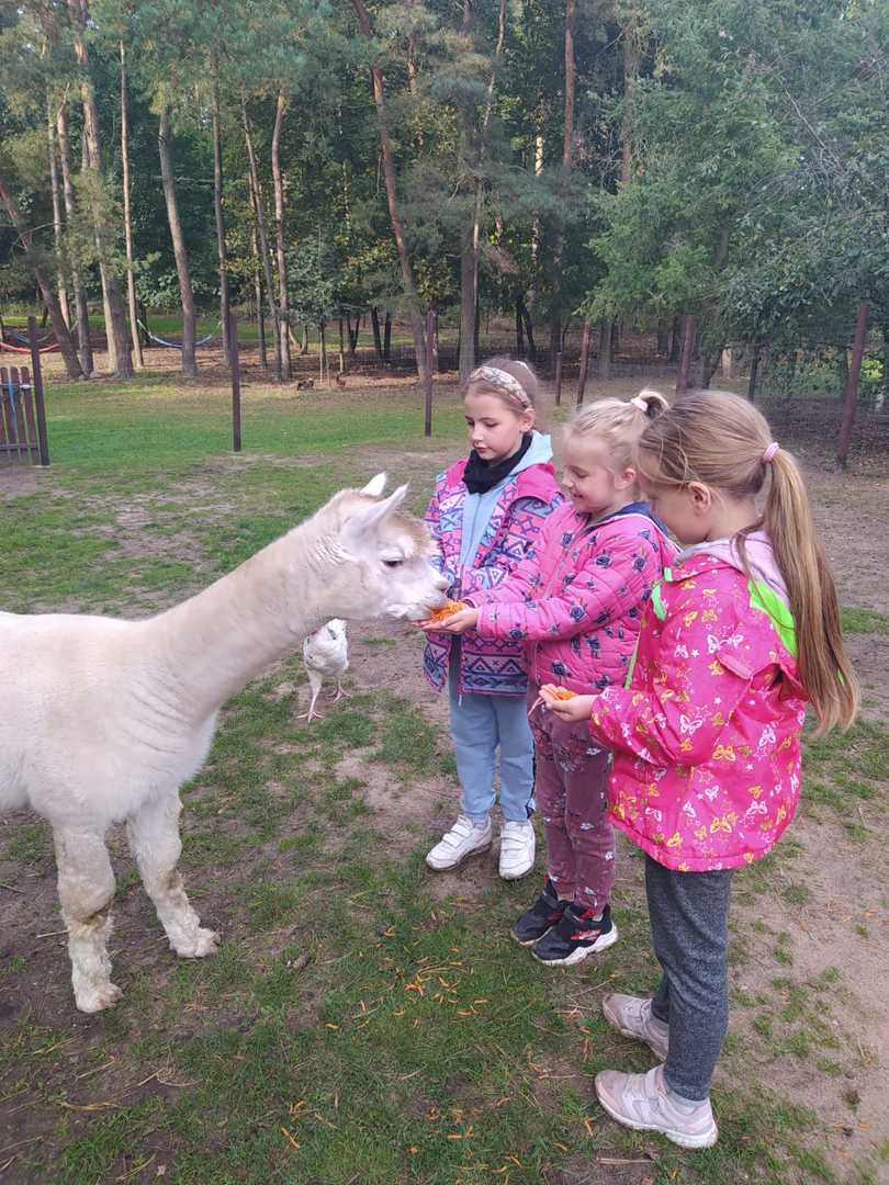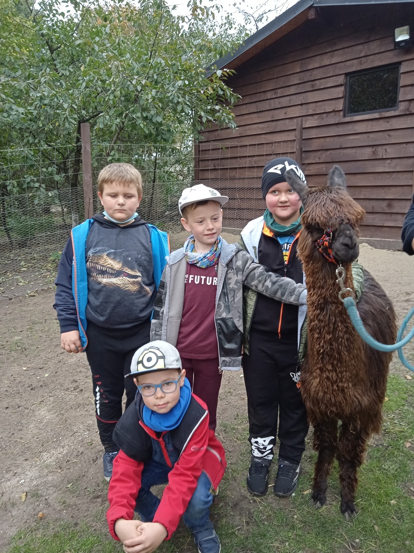 Na początku nasi uczniowie spotkali się z alpakami - dowiedzieliśmy się od pani gospodyni skąd pochodzą te zwierzęta, co jedzą, jak się nimi należy opiekować a nawet poznaliśmy ich imiona. Najbardziej przypadł nam do gustu Enrike. Był najbardziej towarzyski i pozwalał się nam dotykać a nawet czesać.