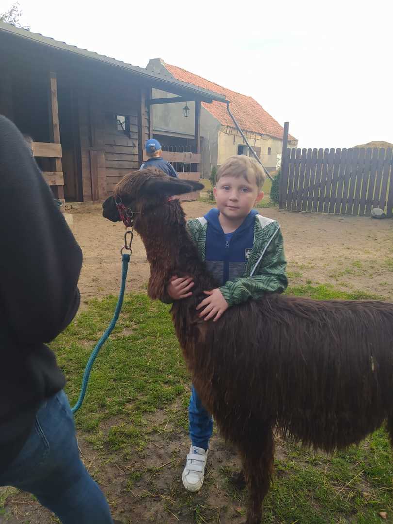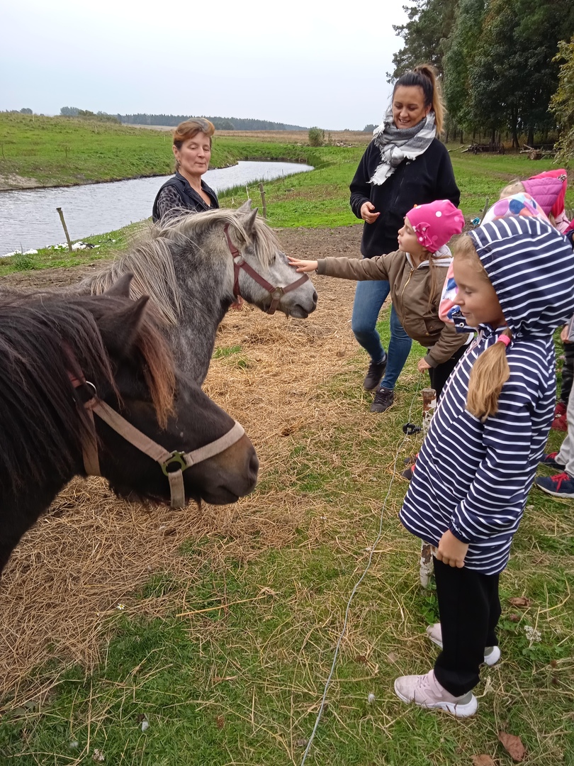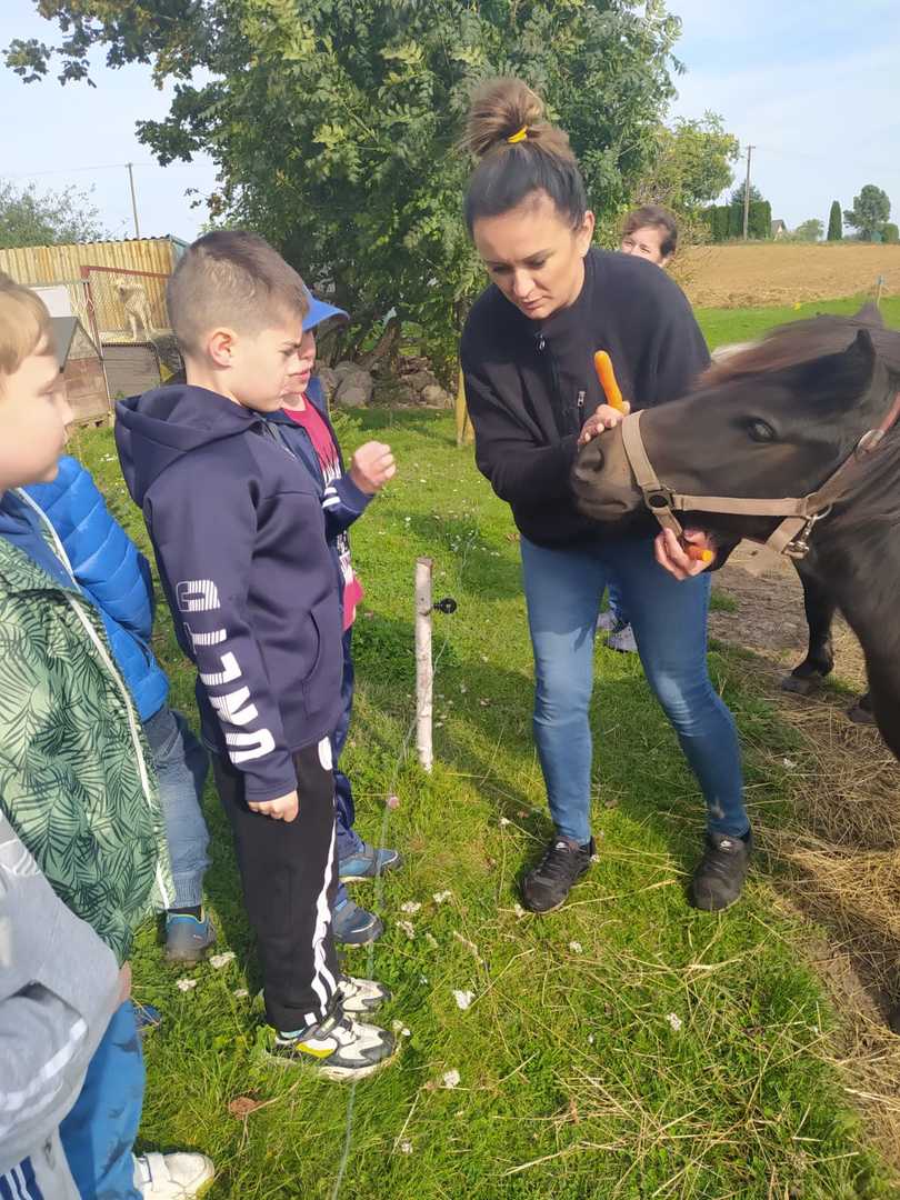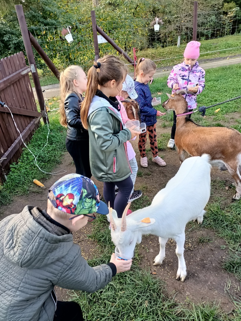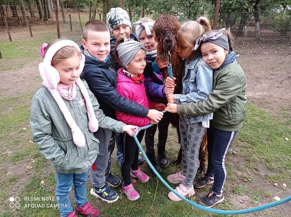 Na początku nasi uczniowie spotkali się z alpakami - dowiedzieliśmy się od pani gospodyni skąd pochodzą te zwierzęta, co jedzą, jak się nimi należy opiekować a nawet poznaliśmy ich imiona. Najbardziej przypadł nam do gustu Enrike. Był najbardziej towarzyski i pozwalał się nam dotykać a nawet czesać.