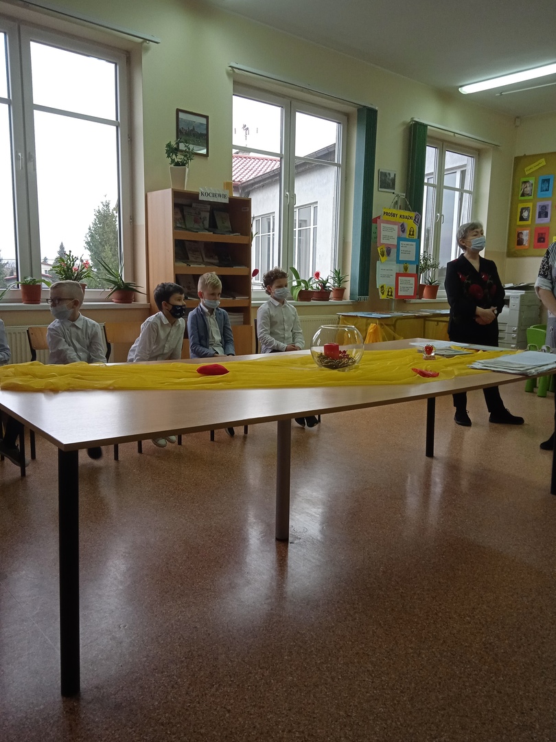 Najpierw klasa I B , a następnie I A odświętnie ubrani i wyjątkowo przejęci przybyli do biblioteki wraz ze swoimi paniami.