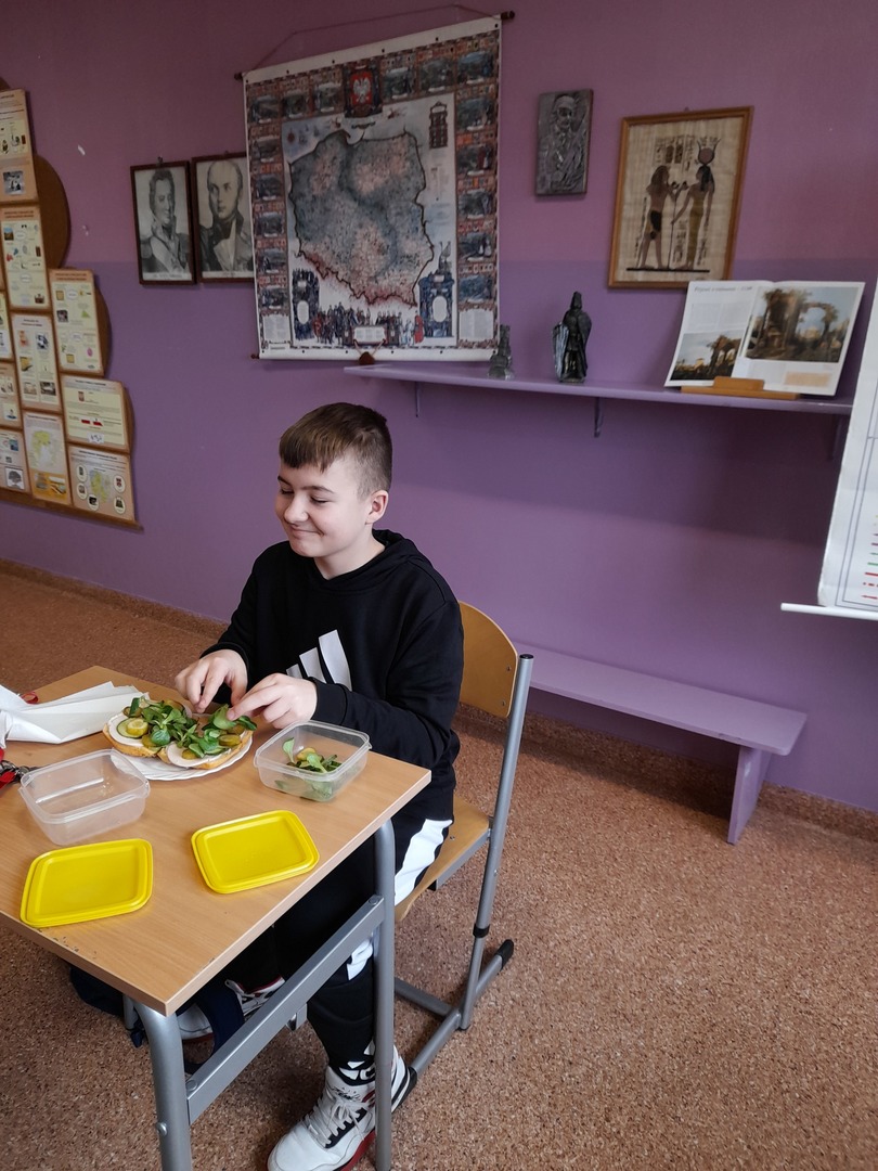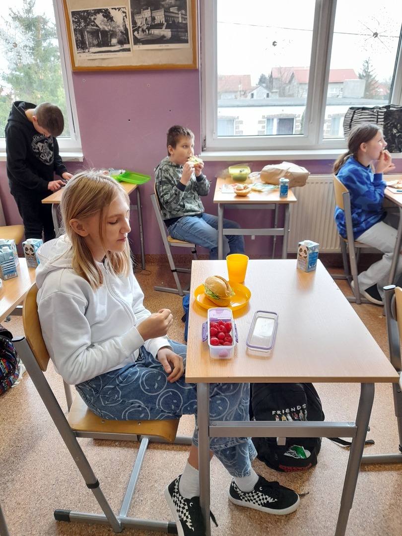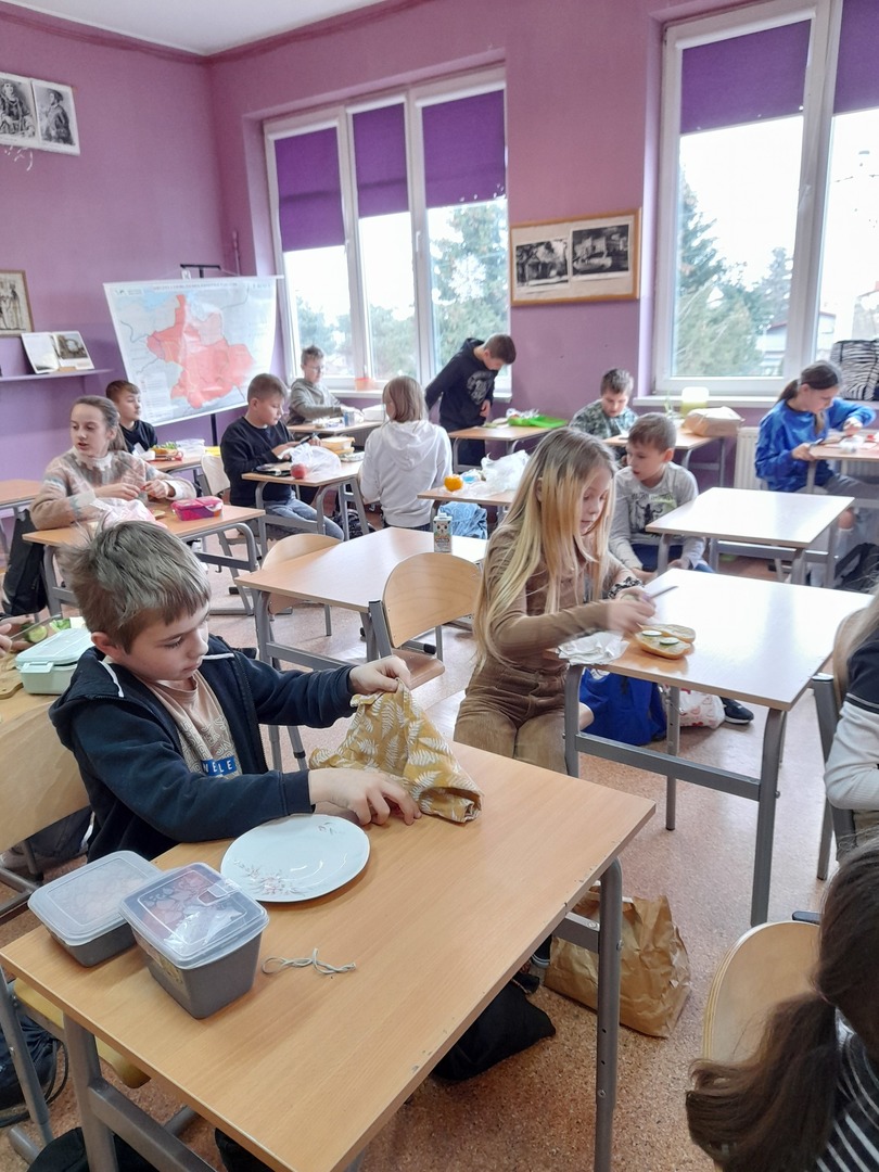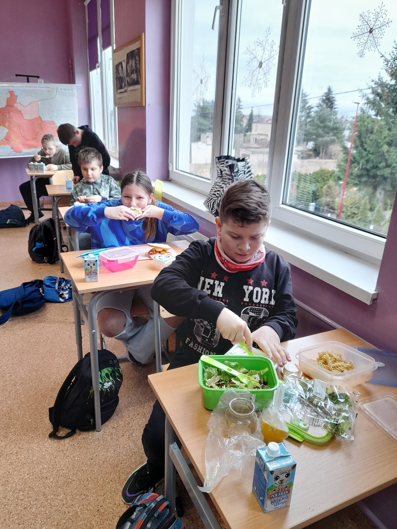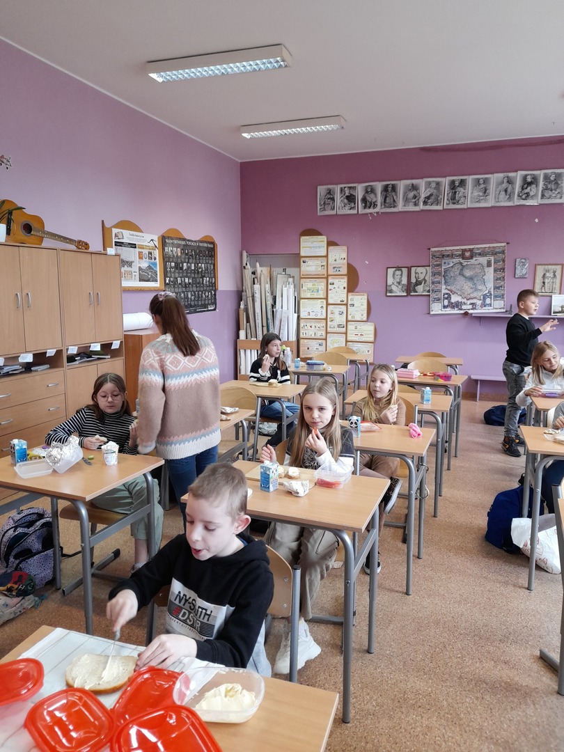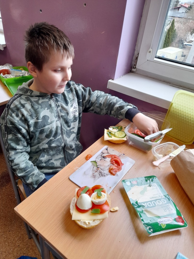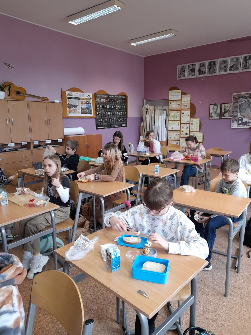 Uczniowie, wraz ze swoją wychowawczynią panią Magdaleną Fraszkiewicz, na lekcji wychowawczej przygotowywali zdrowe i smaczne śniadanie.