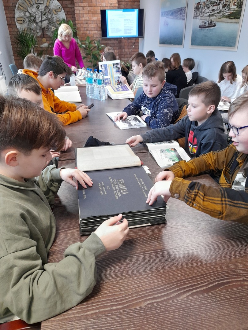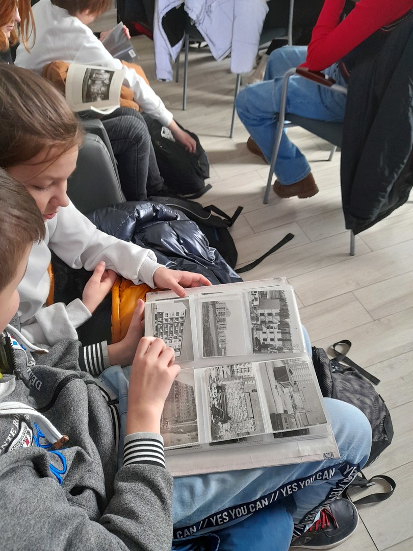 Uczniowie przeglądali biblioteczne archiwalia w tym kroniki, czy albumy, wśród których mogli wypatrzyć dawne zdjęcia naszego osiedla.