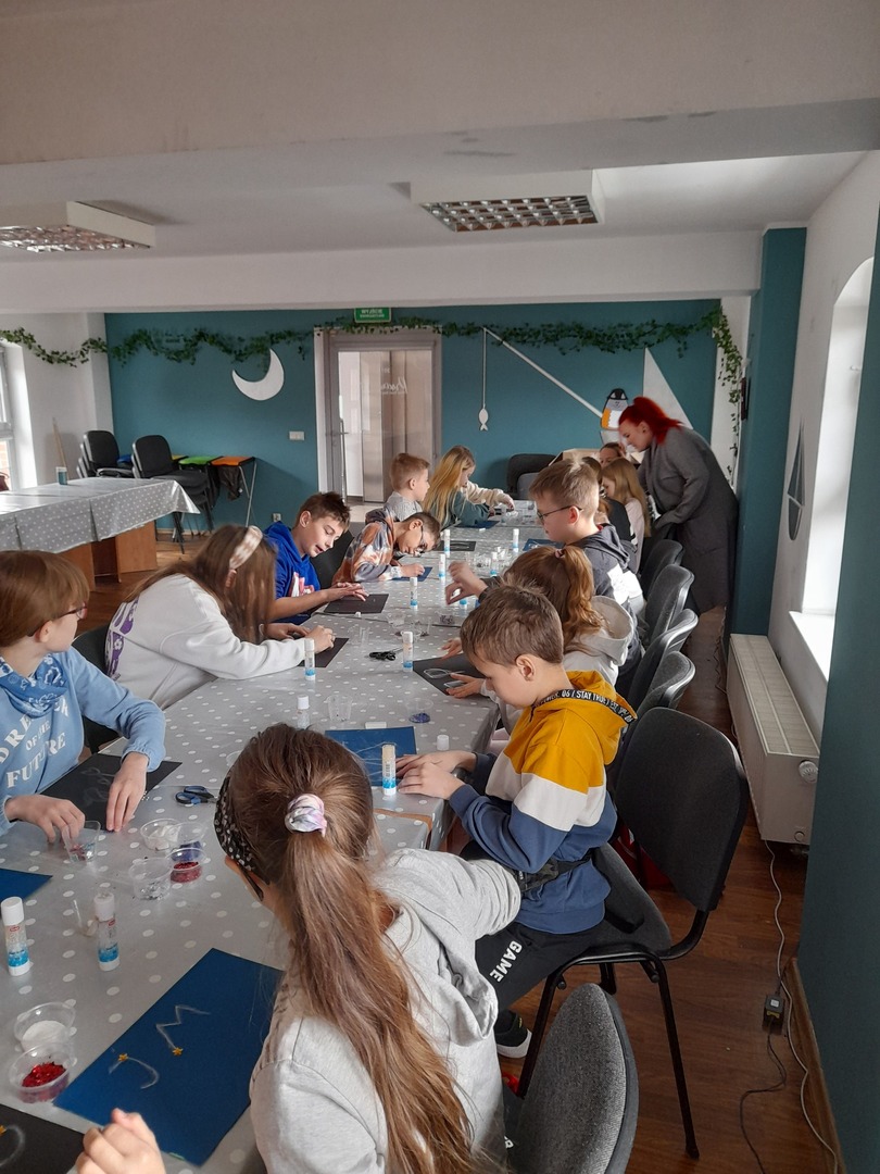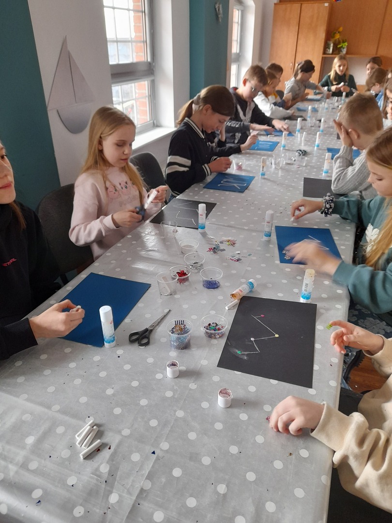 Z kolei części warsztatowej dzieci wykonały prace plastyczne pt. "Nocne niebo". Wyobraźnia uczniów nie znała granic i na kartkach papieru powstały przeróżne konstelacje gwiazd.