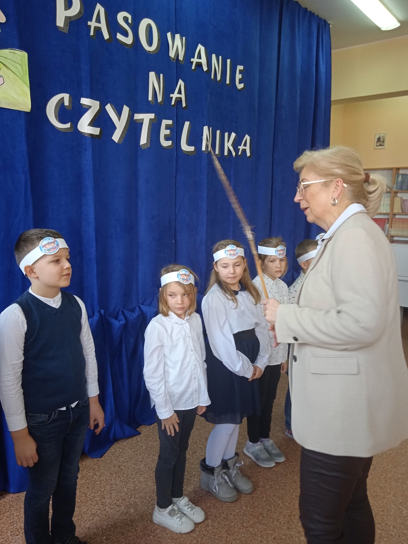Pasowanie odbyło się w atmosferze bajkowej, która to sprzyjała powtórzeniu i utrwaleniu poznanych wcześniej wiadomości o bibliotece i książkach.