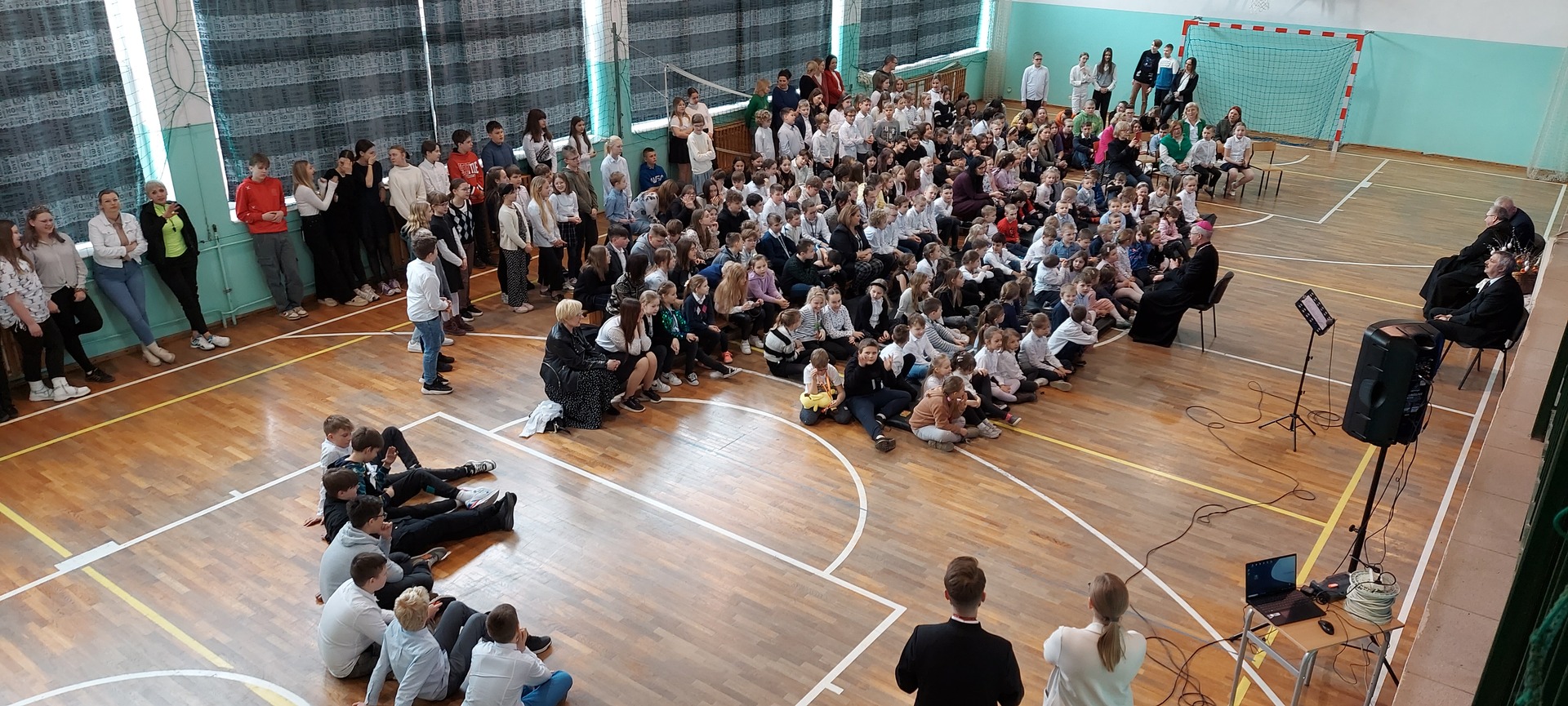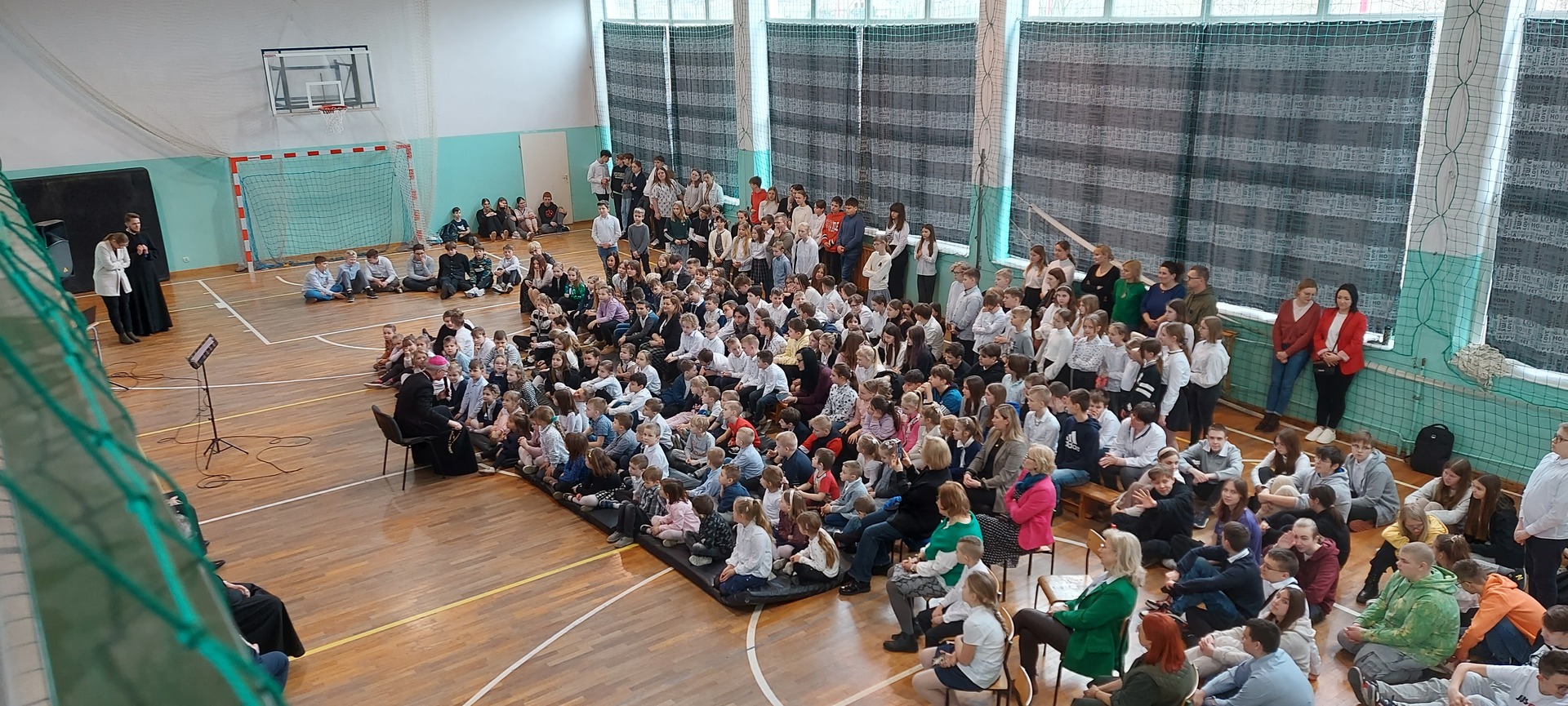 Ksiądz biskup opowiedział przypowieść o małej Anetce, jej chorym bracie i o mocy cudu. Następnie wspólnie modliliśmy się różańcem za ks. proboszcza, pana i panią dyrektor, za nauczycieli, za księży, za wszystkich uczniów naszej szkoły i o pokój na świecie, a zwłaszcza w Ukrainie. Wspólnie odśpiewaliśmy “Barkę”.