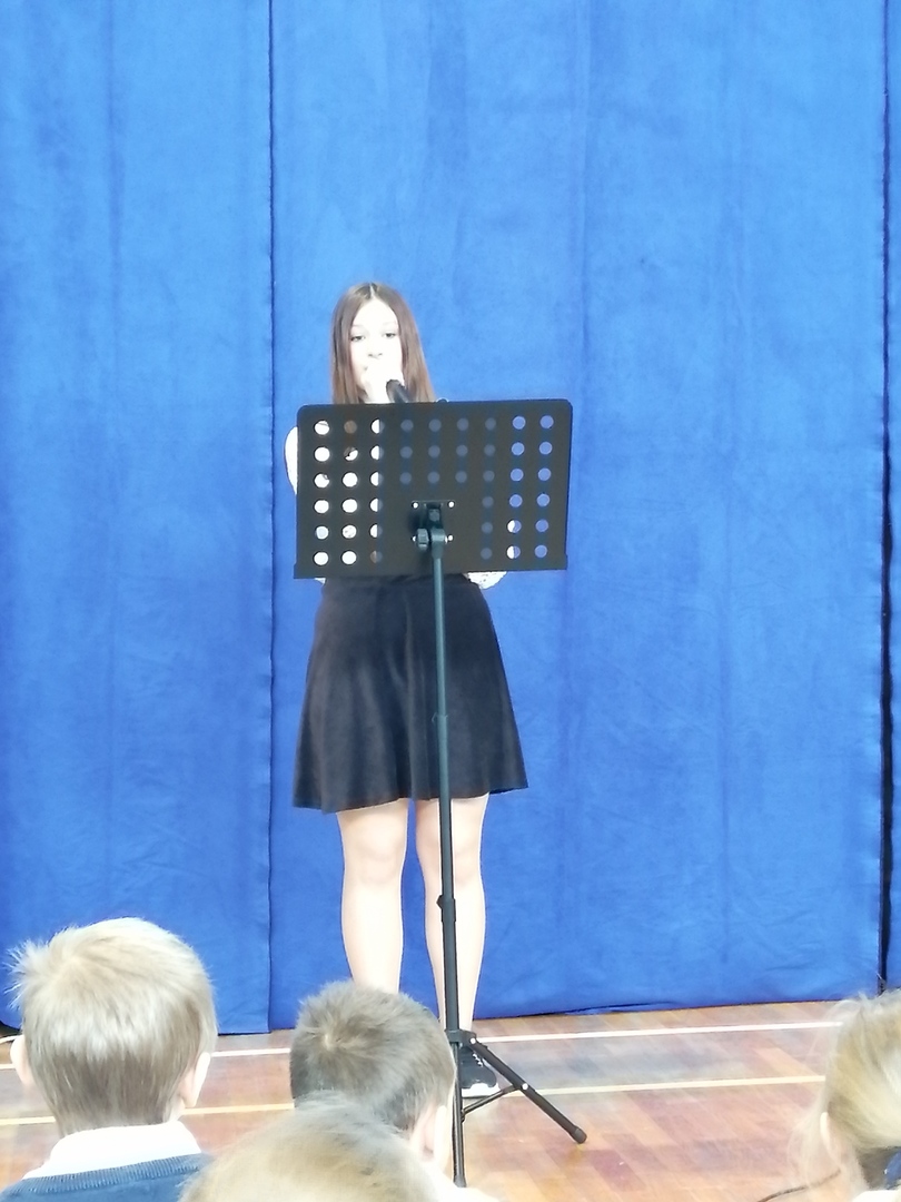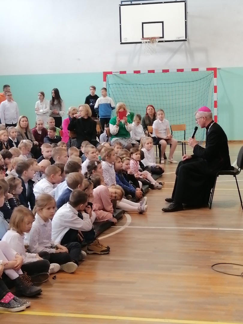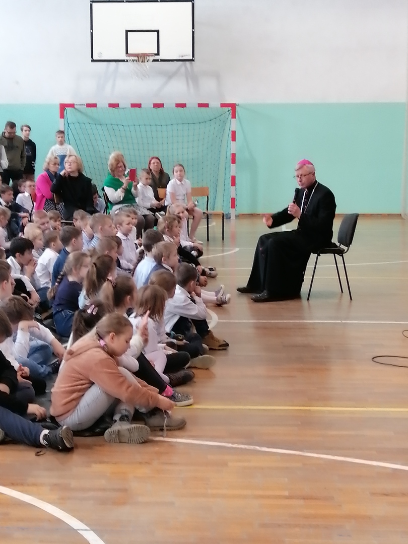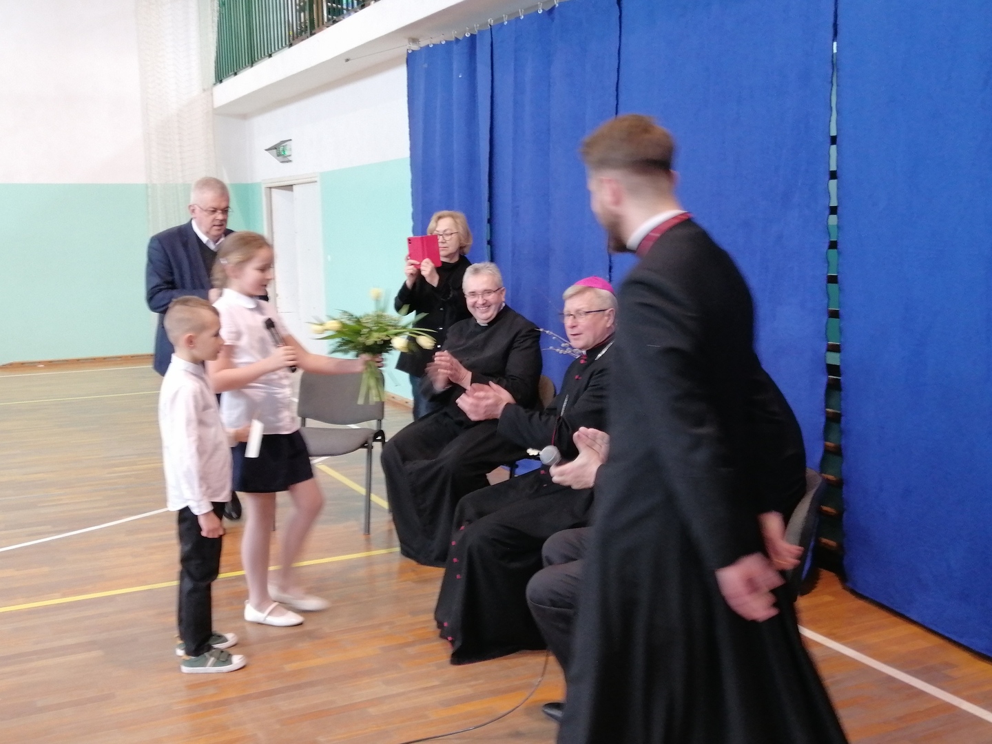 Spotkaliśmy się z księdzem biskupem na sali gimnastycznej. Najpierw uczniowie klas młodszych - Zuzanna Kurowska z kl. III B i Kacper Speizer z kl. II A przywitali księdza biskupa, a następnie wspólnie z Zuzanną Daniel z kl. VIII B zaśpiewaliśmy pieśń “Błogosławieni miłosierni”.