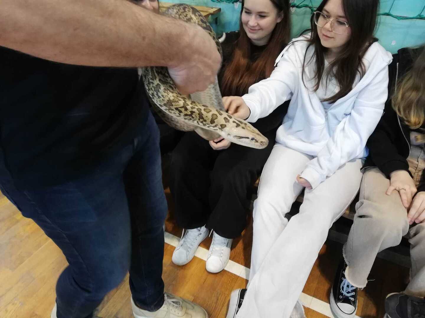 Prowadzący zajęcia pan to prawdziwy pasjonat i miłośnik przyrody. Wyjątkowość lekcji stanowiła obecność licznych gadów - pytonów. Niektóre z nich można było nawet dotknąć lub pogłaskać, czemu towarzyszyły niesamowite emocje. Oprócz szczegółów na temat życia, zwyczajów i hodowli prezentowanych zwierząt można było się jeszcze dowiedzieć wielu ciekawych i ważnych informacji na temat zależności jakie występują w przyrodzie. Duża część uwagi była skierowana również na właściwości osobnicze, które są różne dla każdego zwierzęcia, wskazując na wyjątkowość wszystkich istot.