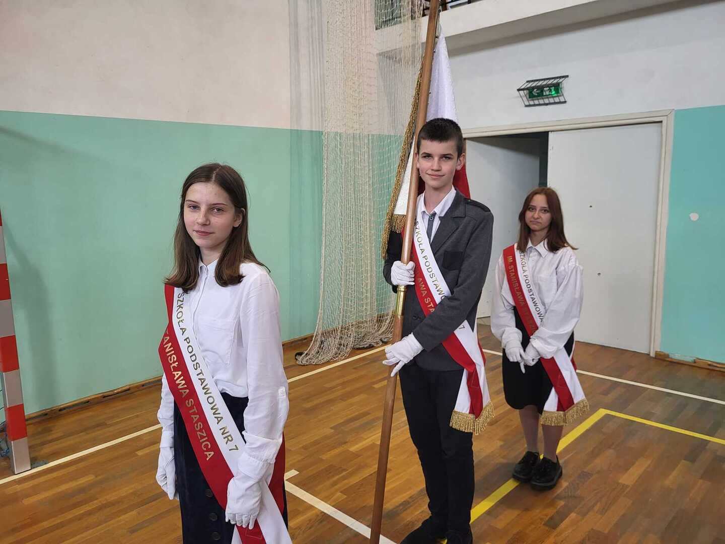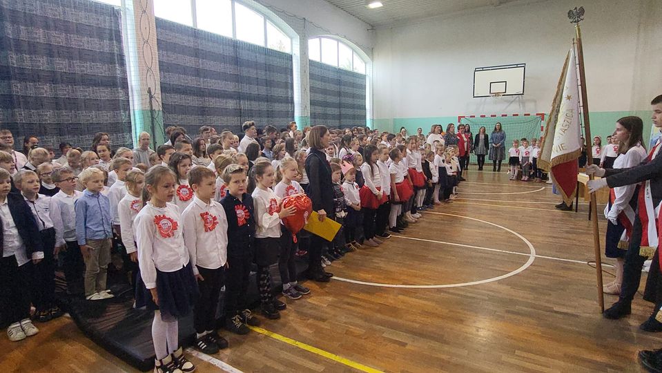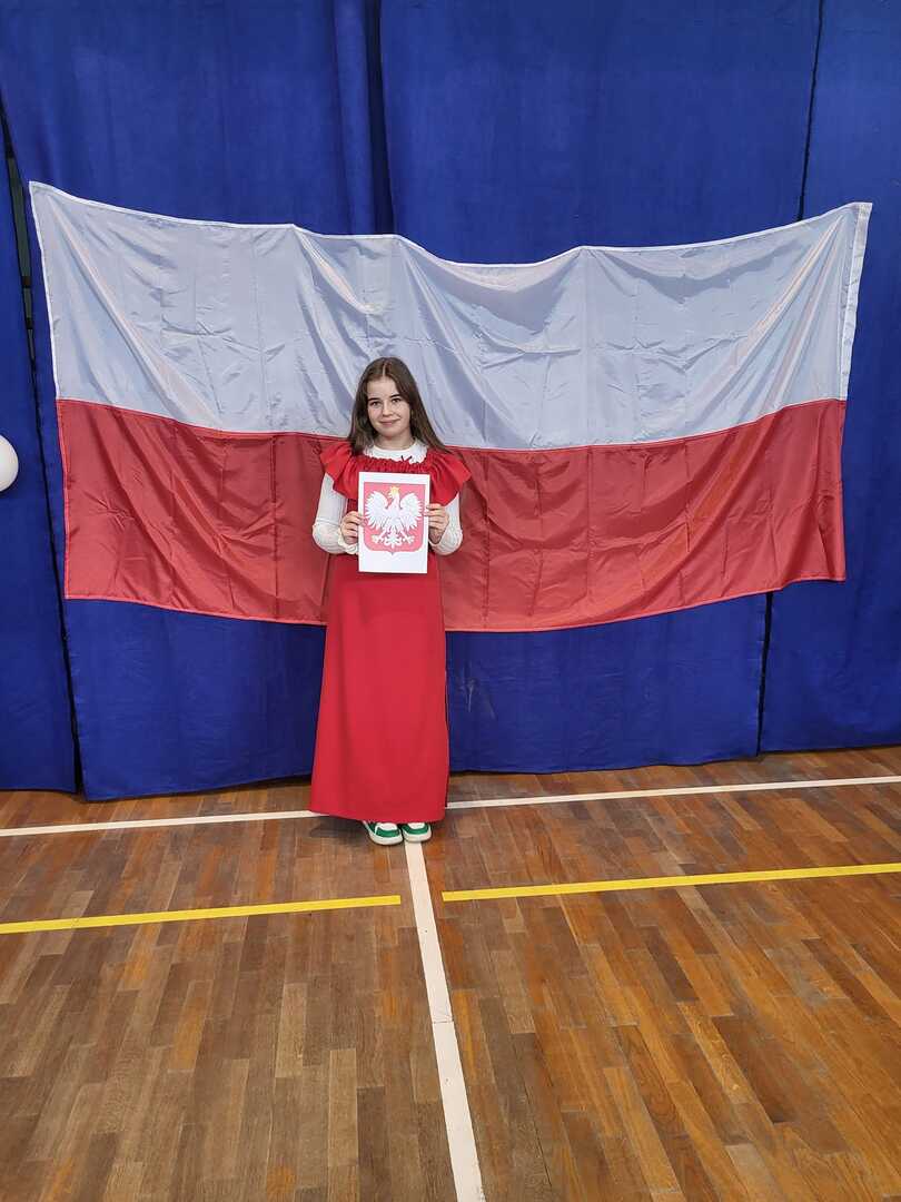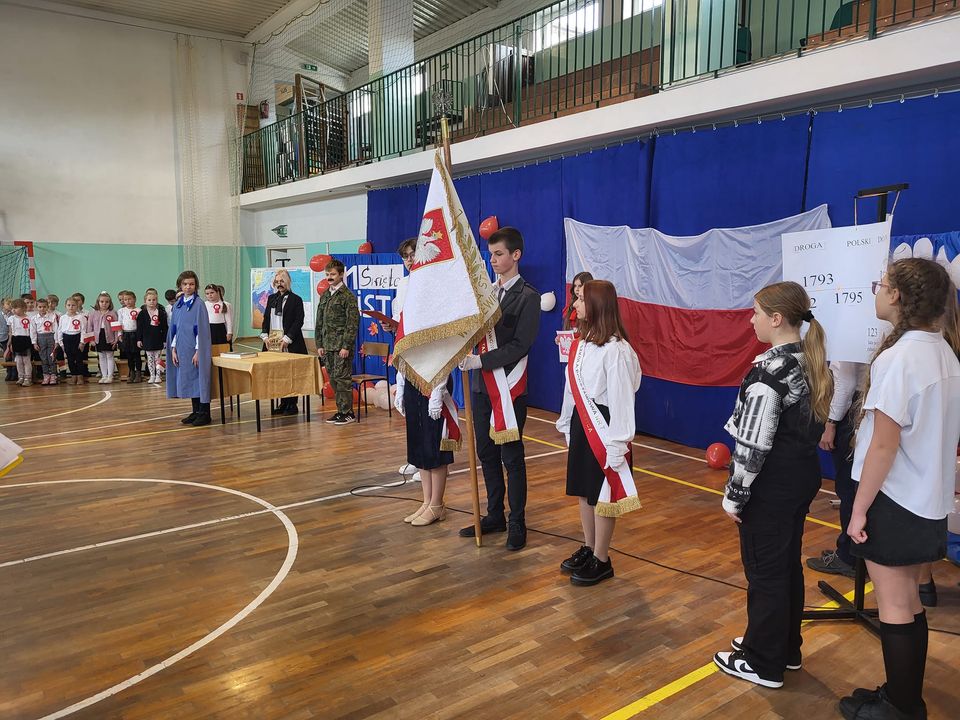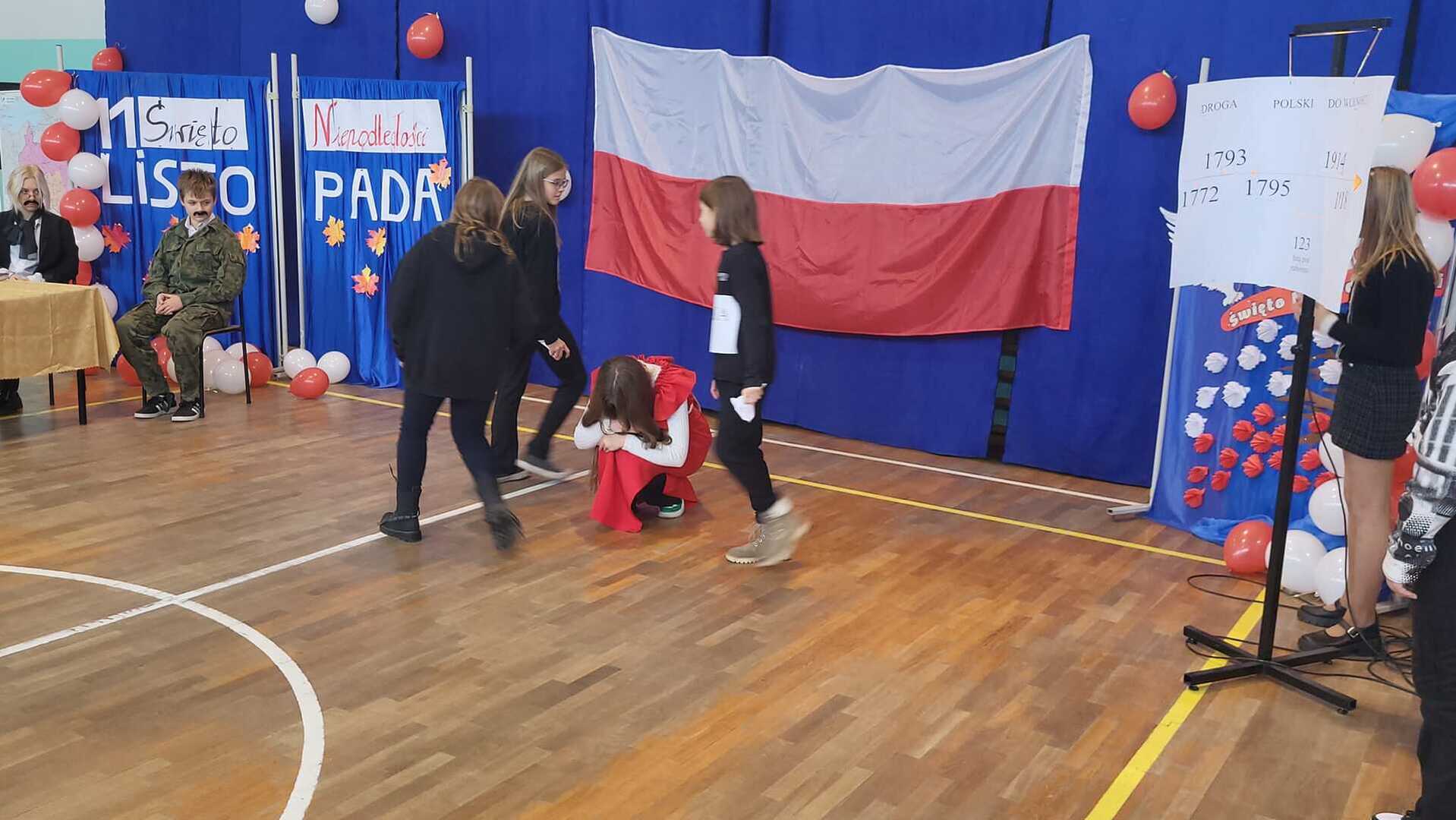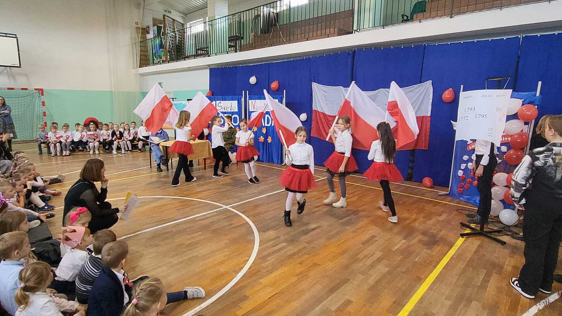 Po wspólnym odśpiewaniu hymnu, klasa 3a zaprezentowała taniec z flagami. Następnie obejrzeliśmy przedstawienie dotyczące historii Polski wykonane przez klasy 5 a i 8a.