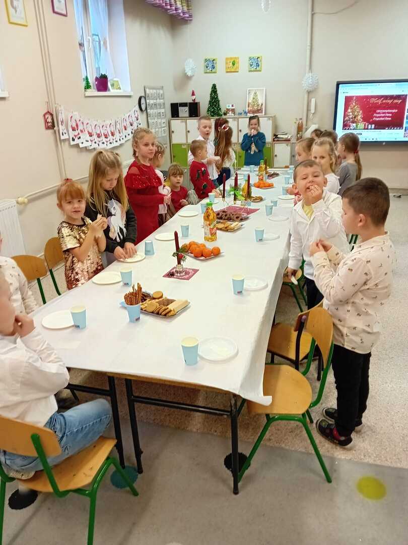 Przy zastawionych stołach - głównie są to słodkości, owoce i napoje - podzieliliśmy się opłatkiem, życząc sobie wszystkiego najlepszego na święta i Nowy Rok.