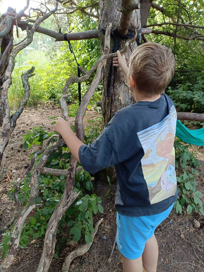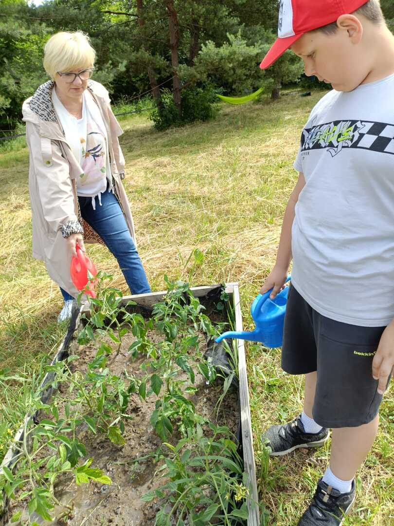 Chłopcy wykazali się pomysłowością przy budowie szałasu. Na zakończenie relaksowaliśmy się w hamakach. Nie zapomnieliśmy też podlać ogrodowych roślinek. Stwierdziliśmy, że najwspanialszy jest wypoczynek na łonie natury.