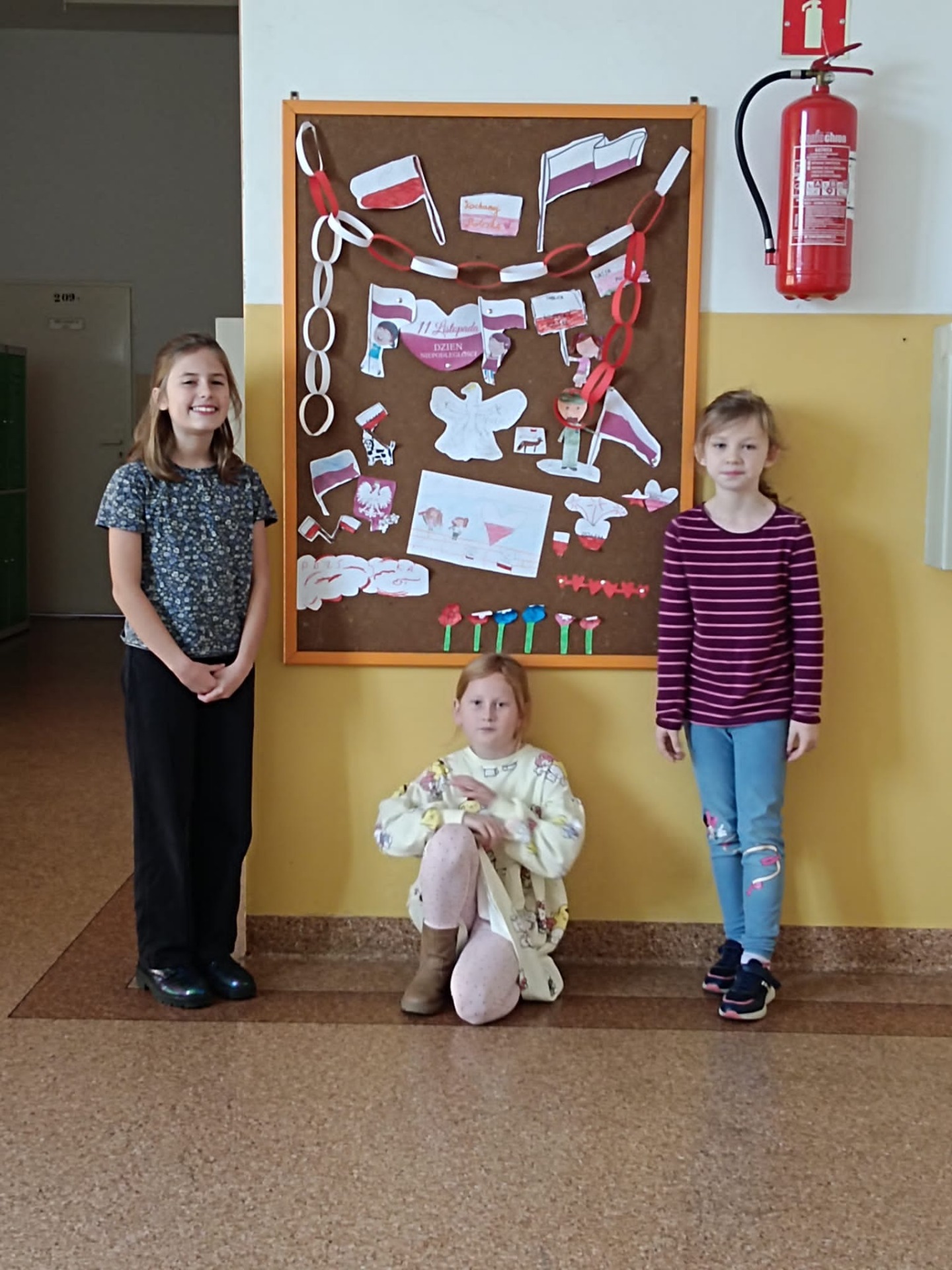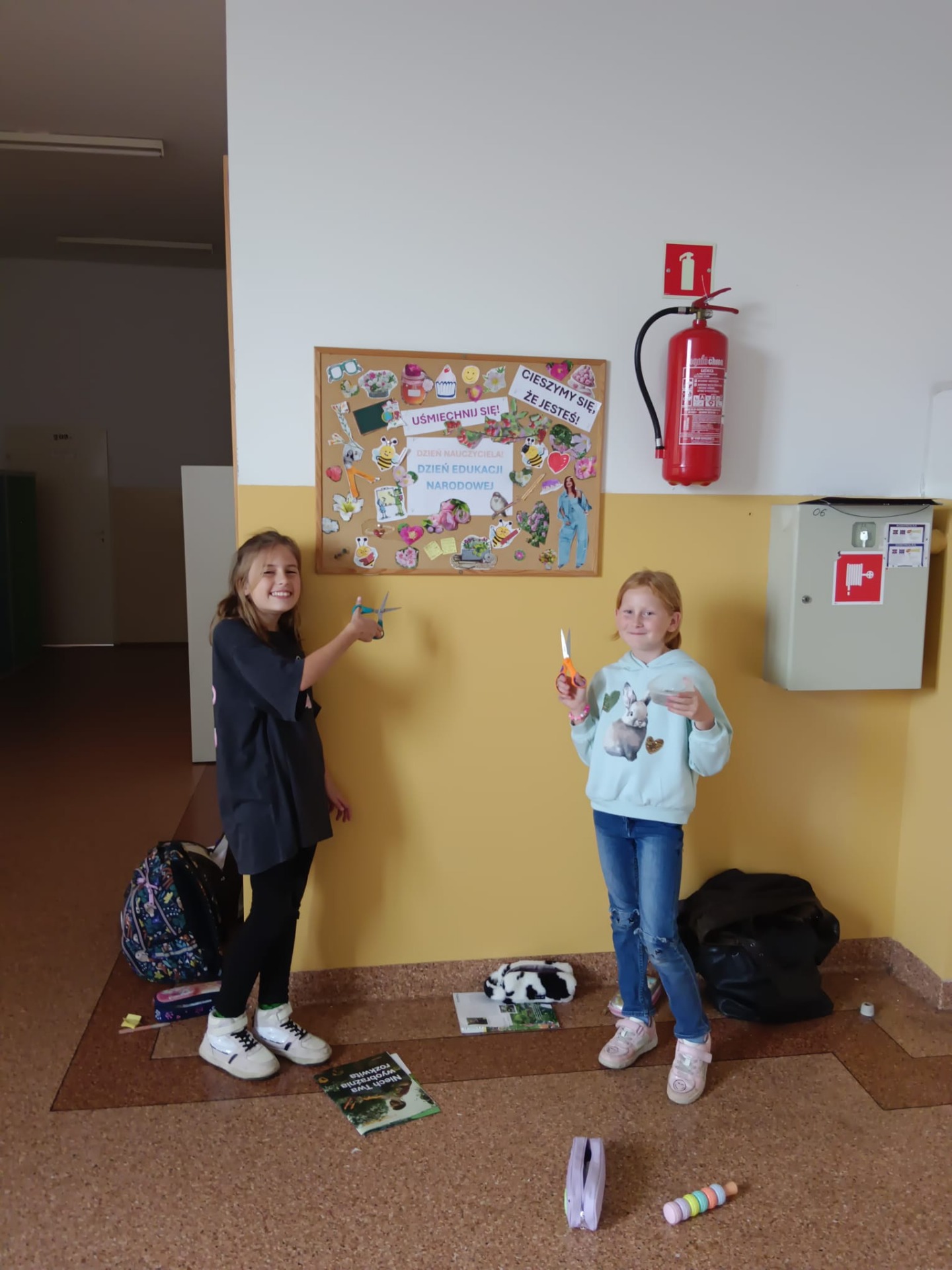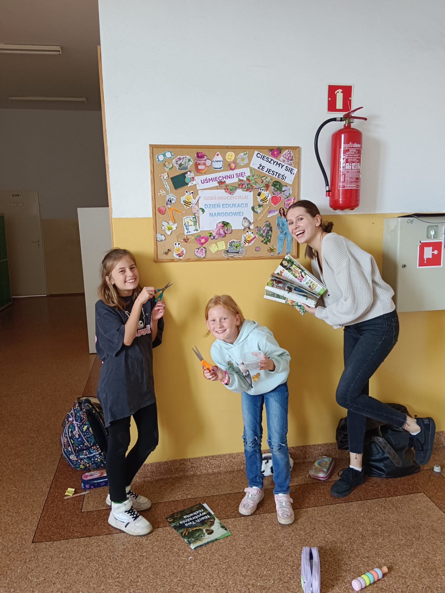 Redaktorki szkolnej gazetki ściennej; Wiktoria Olech, Zosia Korczyńska, Lena Strzałkowska, Agata Selke.