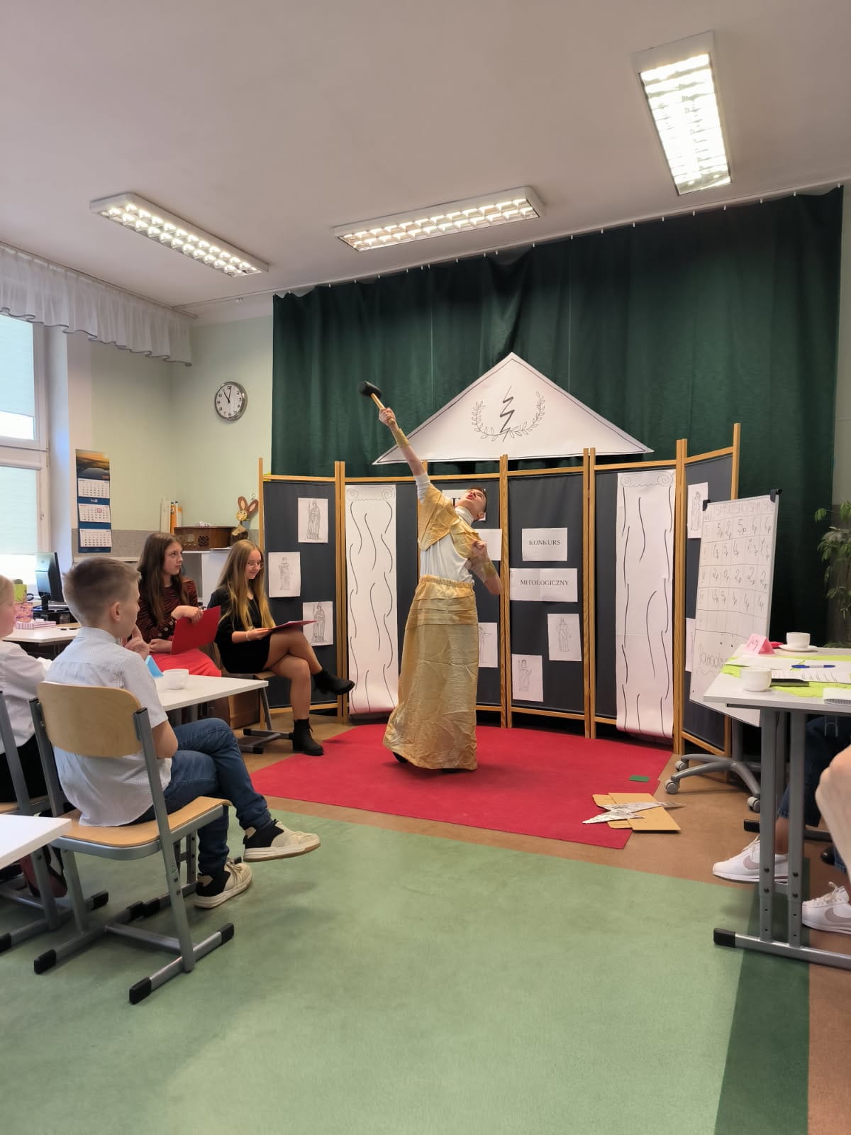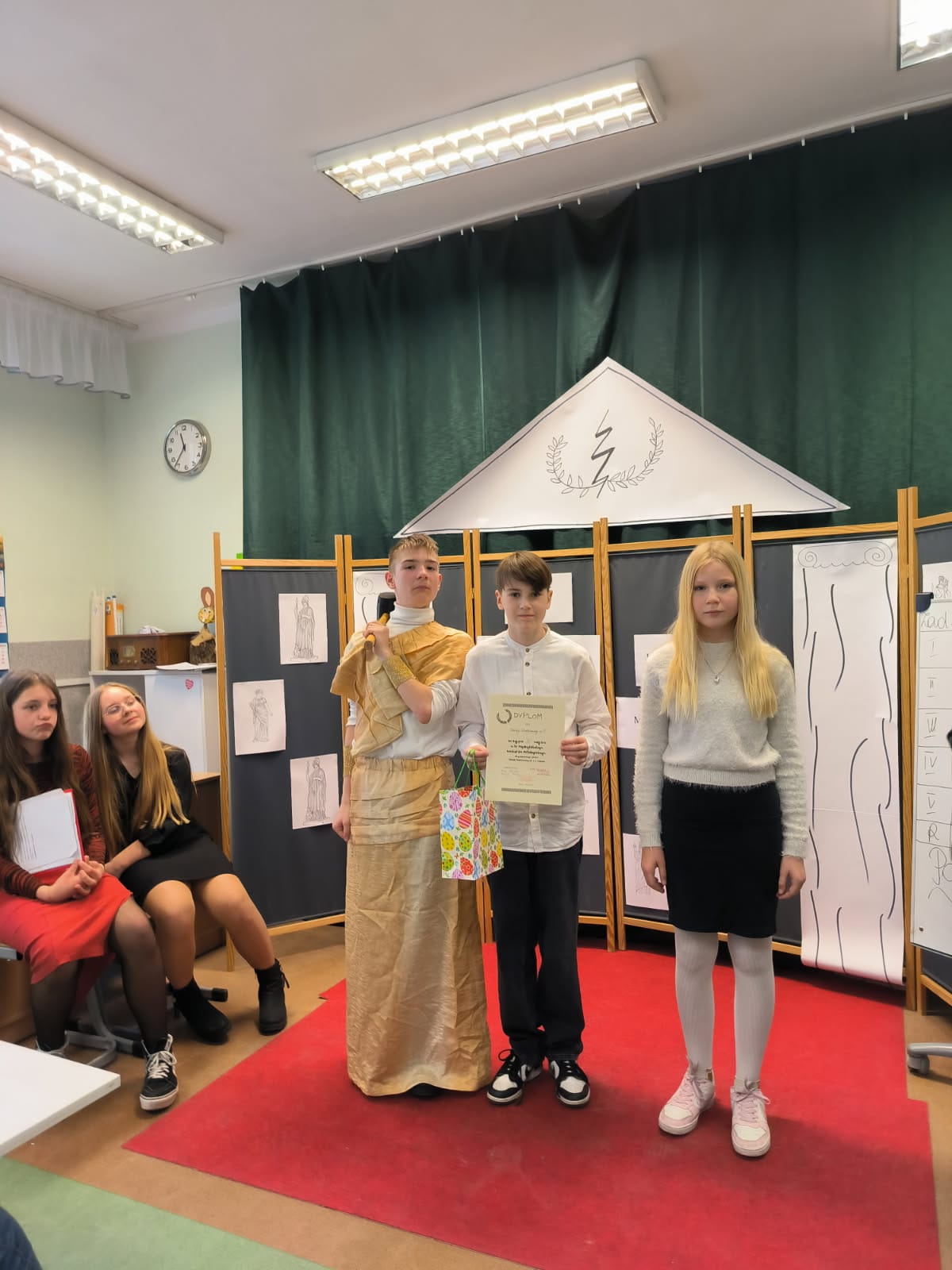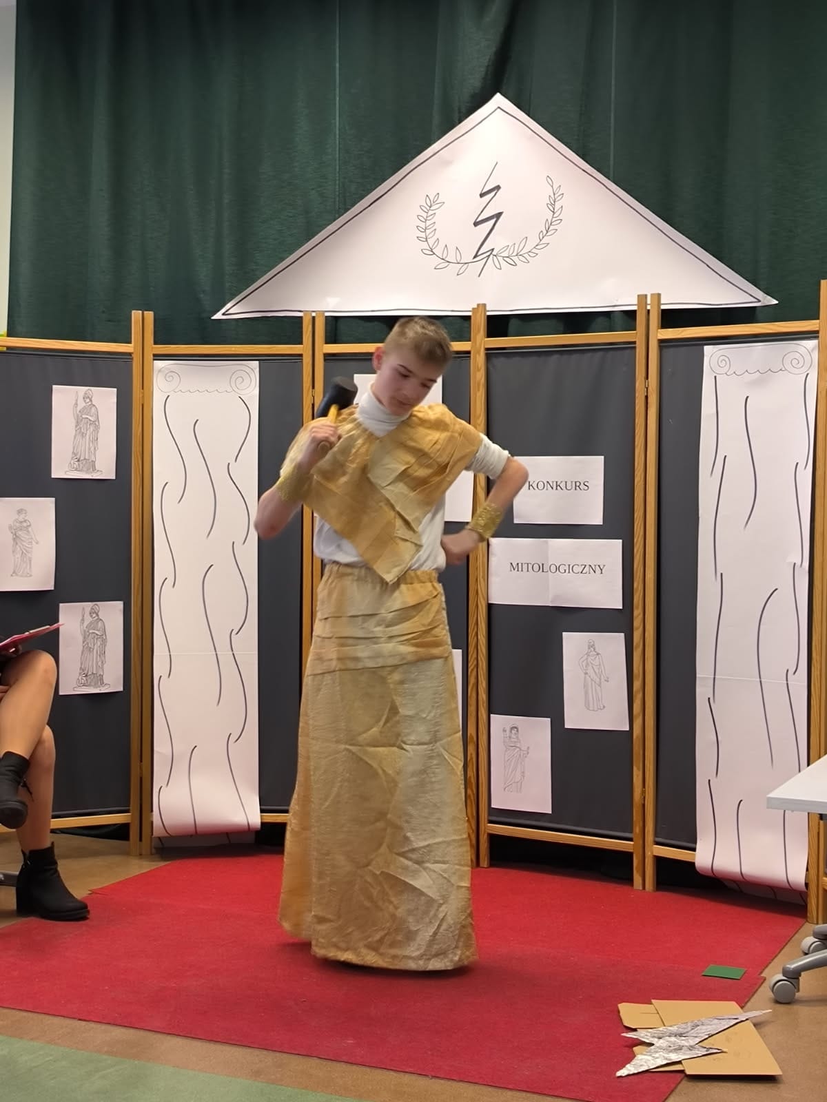 W pierwszym etapie uczestnicy rozwiązywali zadania drużynowo. Mierzyli się z wieloma zadaniami m.in. przedstawili kalambury, hasła dotyczyły związków frazeologicznych pochodzących z mitów czy też wykazali się znajomością mitycznych potworów i atrybutów. Uczniowie świetnie znali mity i wykonali wszystkie zadania na bardzo wysokim poziomie. Drugi etap konkursu polegał na zaprezentowaniu wybranego boga greckiego. W tej konkurencji zaprezentował się Aleksander jako Hefajstos.
