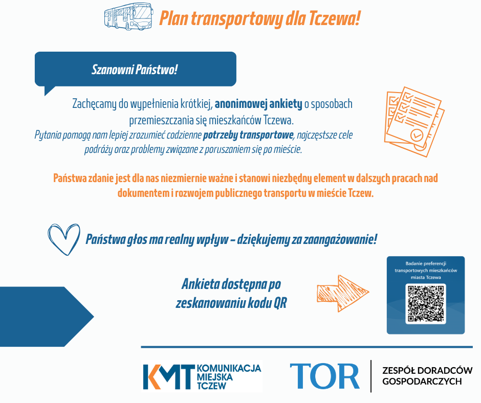 ��️ Ankieta odbywa się w ramach opracowania Planu Zrównoważonego Rozwoju Publicznego Transportu Zbiorowego dla Tczewa na lata 2026-2030. Dokument ten wskaże kierunki działań samorządu lokalnego w zakresie: rozwoju sieci połączeń autobusowych, dostosowania rozkładów jazdy do potrzeb mieszkańców, a także poprawy dostępności