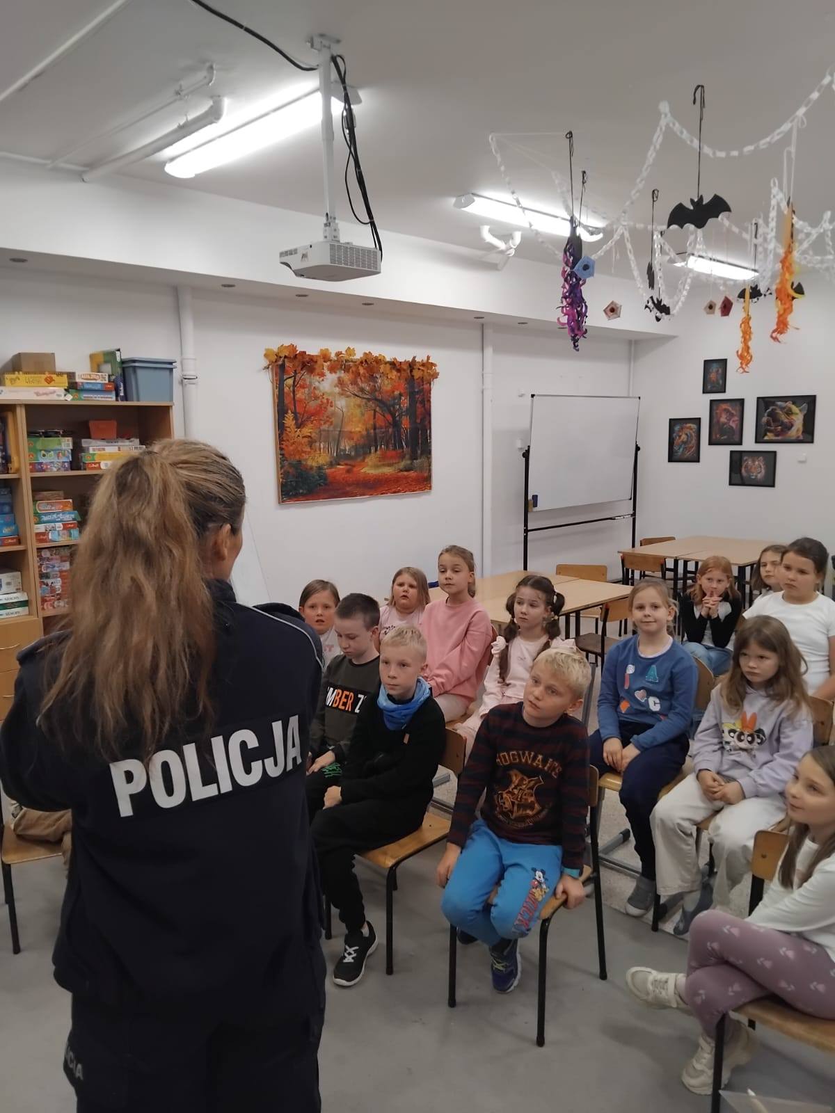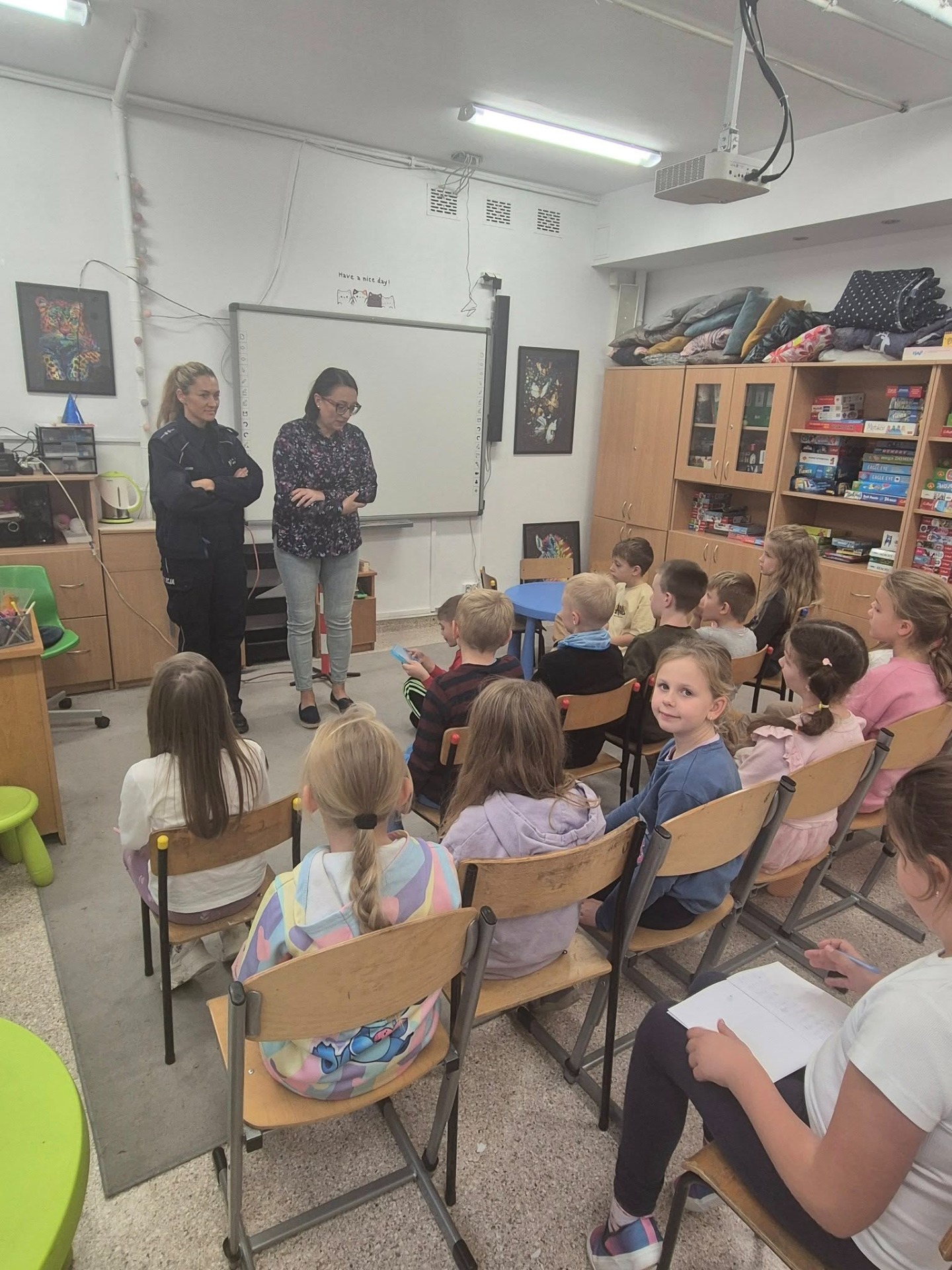 Pani Wioletta omówila z dziećmi m.in. zasady bezpiecznego poruszania się po drogach i zasady bezpiecznego korzystania z sieci.